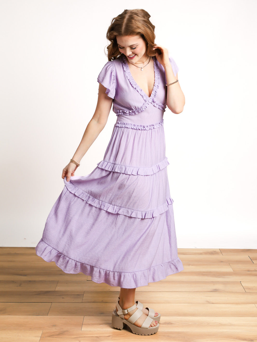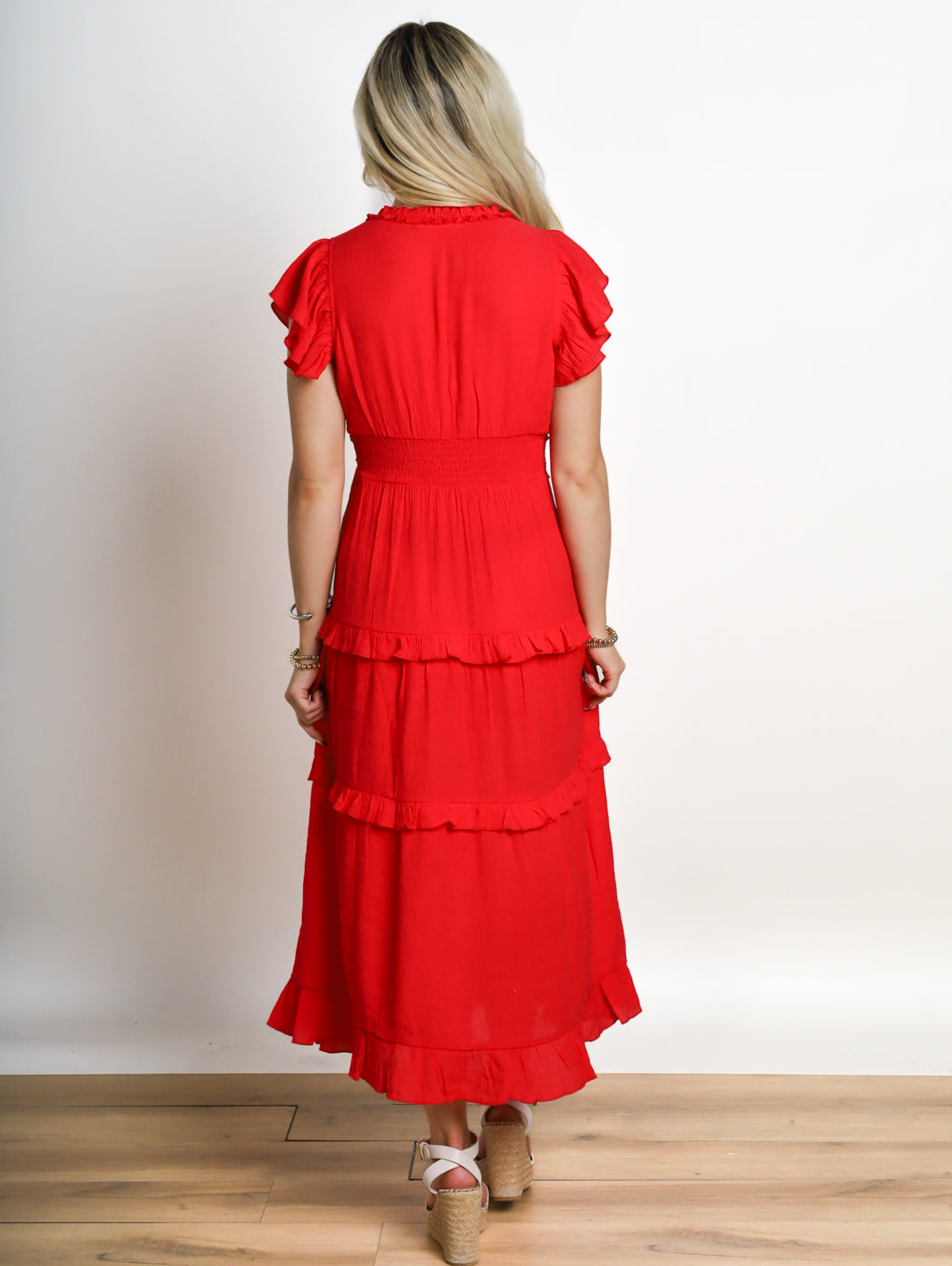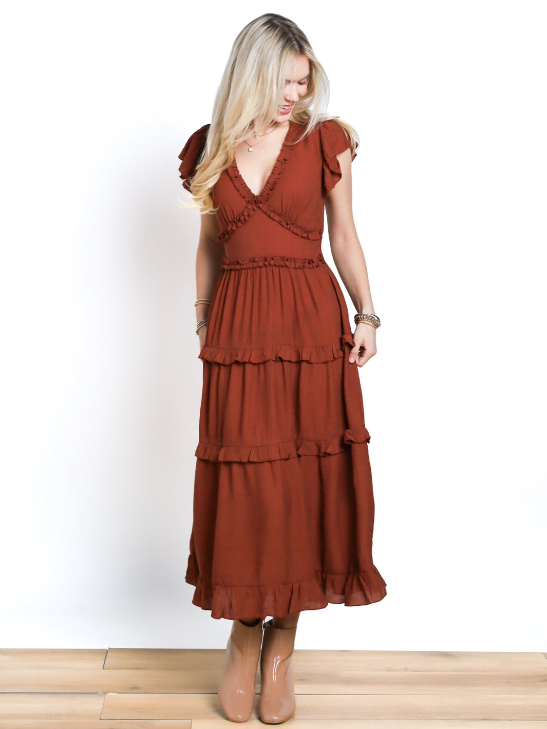 Be the life of the party in our Sharing My Day Dream dress! This midi dress features a playful v-neckline, ruffled details, and flutter sleeves. Available in a variety of colors. Best selling and perfect for any occasion.