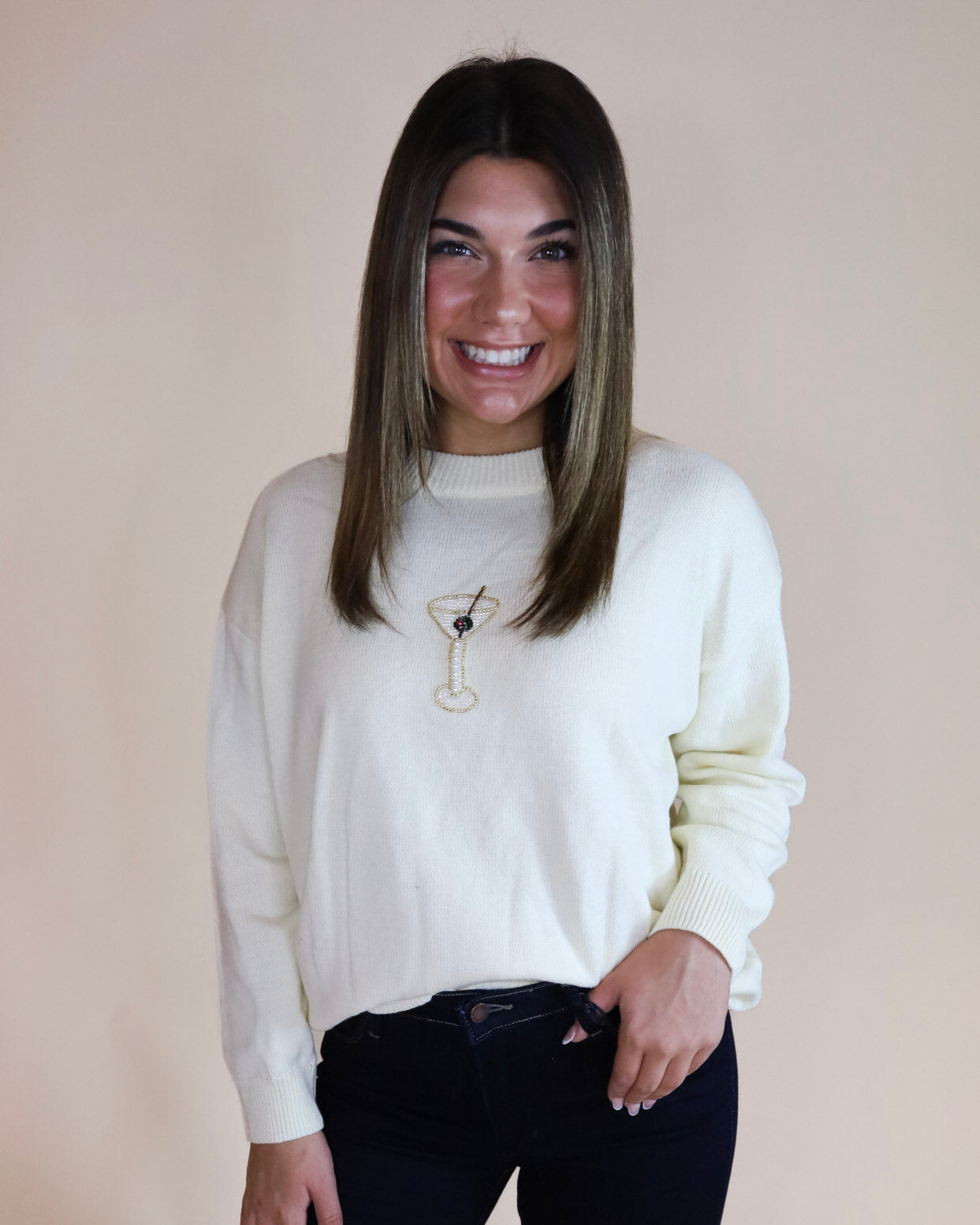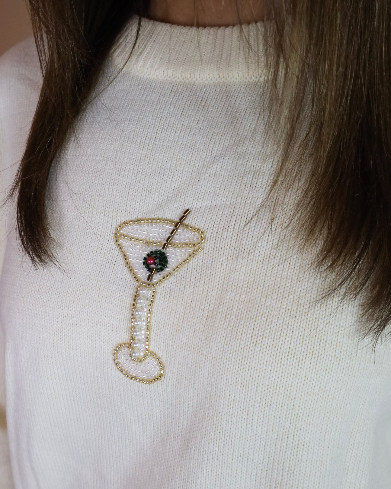 The Beaded Martini Glass Graphic Sweater offers a sophisticated, festive touch perfect for the holidays. Its elegant beaded design pairs beautifully with skirts or jeans, making it an ideal choice for stylish seasonal gatherings that blend comfort with refined holiday spirit.