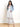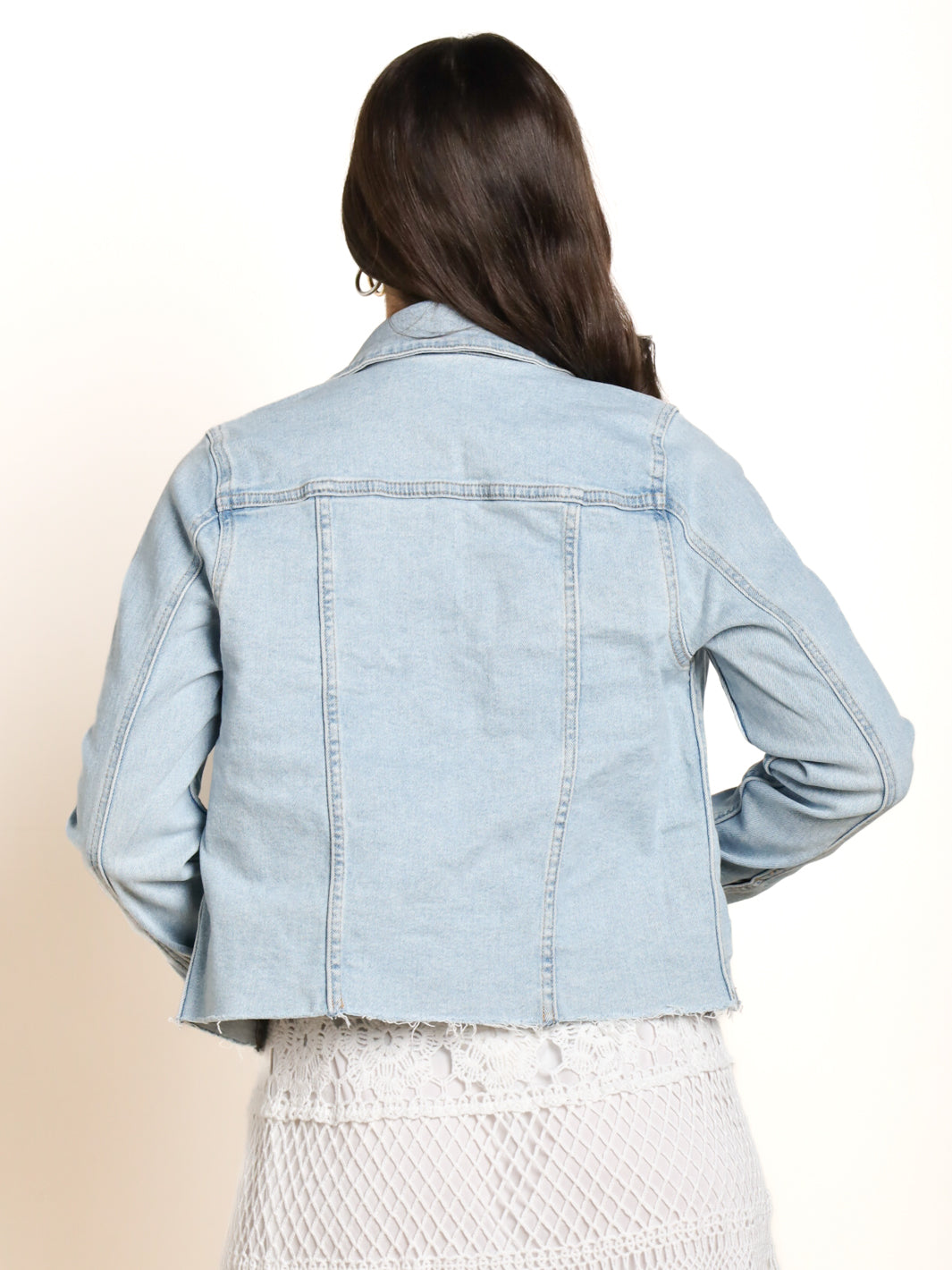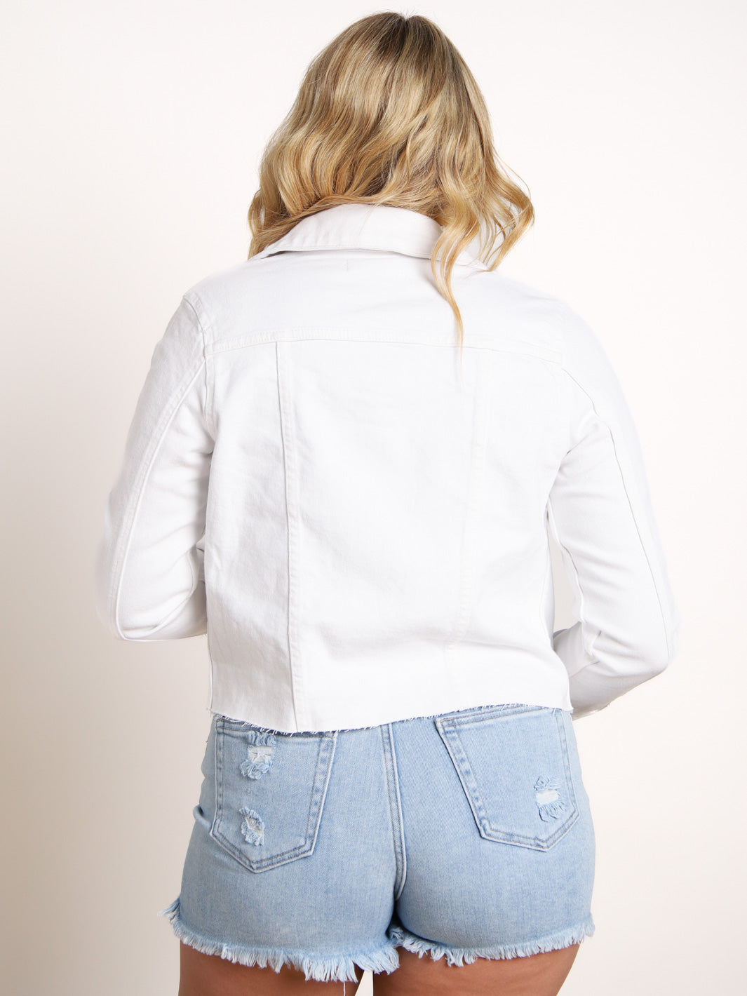 Model wearing a cropped white denim jacket. Model wearing a cropped white denim jacket.