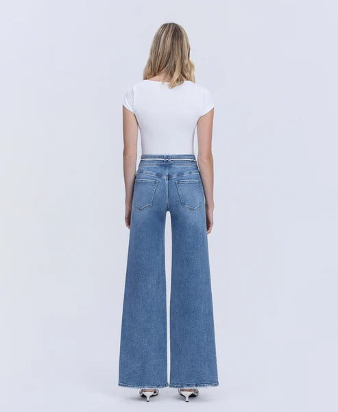 Comfort stretch denim, high rise waist, 5 pockets, white drawstring waistband, double buttons, finished hem, full length, wide leg jeans