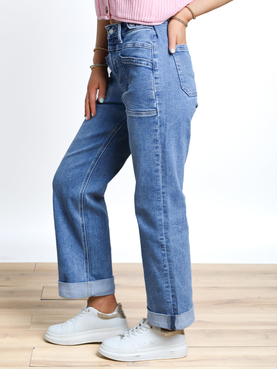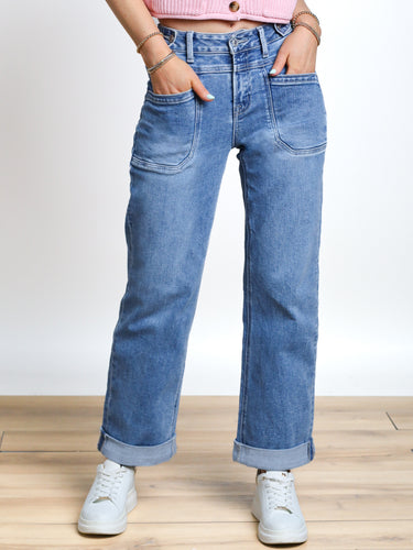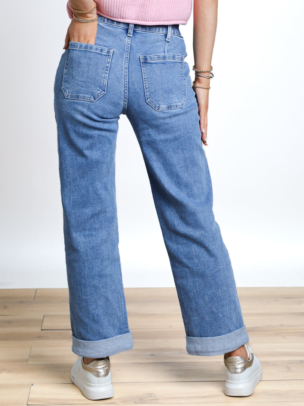 Elevate your style with Gianna High Rise Cuffed Slim Wide Leg Jeans from VERVET. These medium wash denim jeans feature a slim wide leg fit and a bottom cuff for a unique look. With front pocket details and an adjustable waistband, these jeans are both stylish and comfortable.