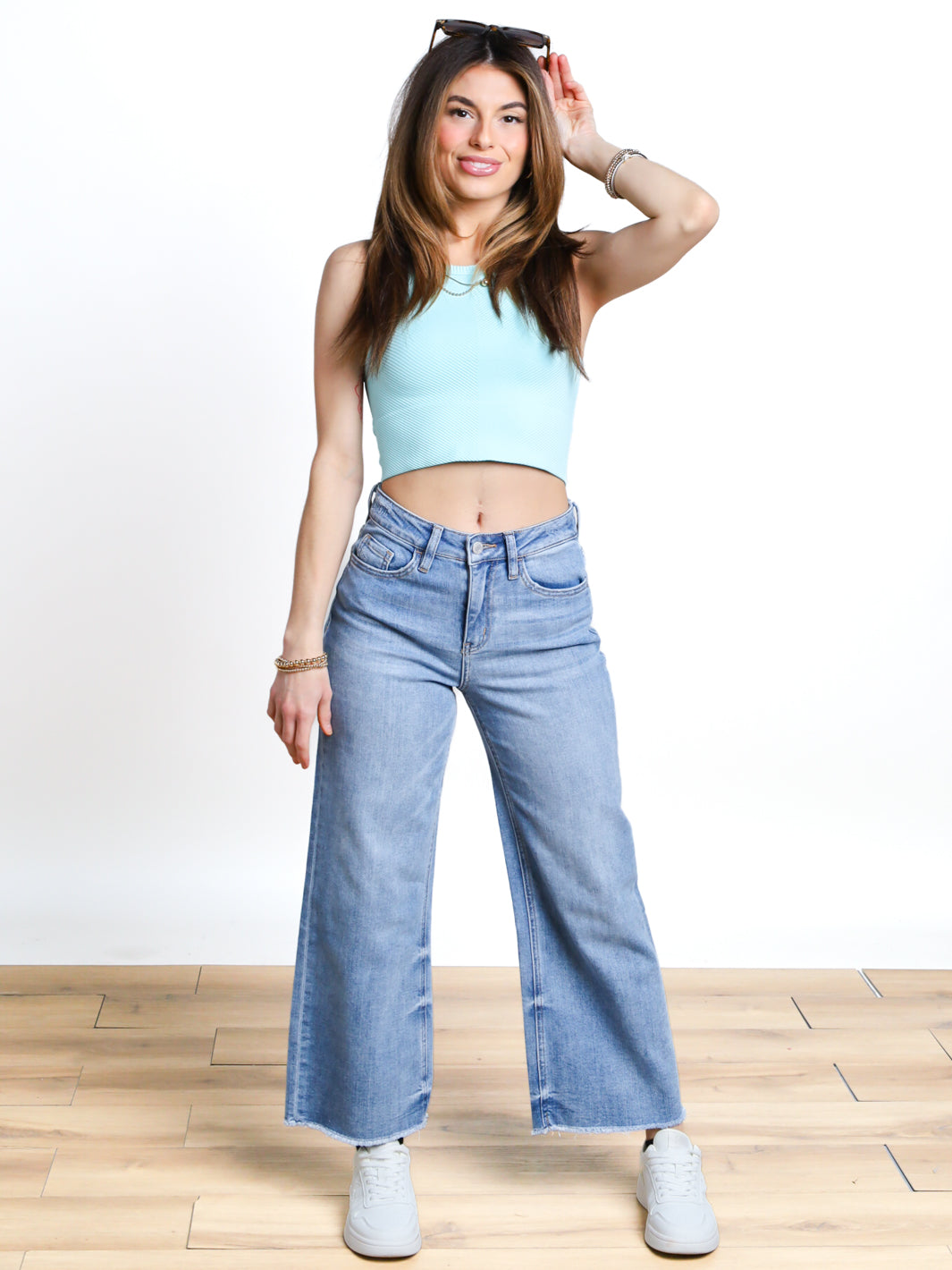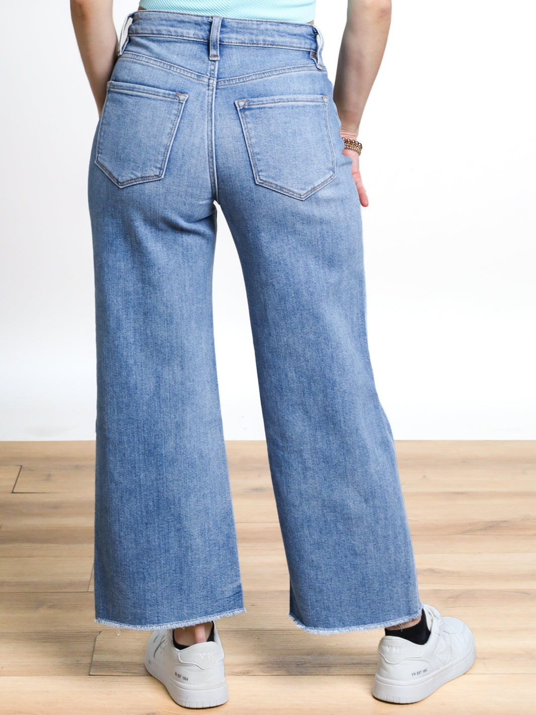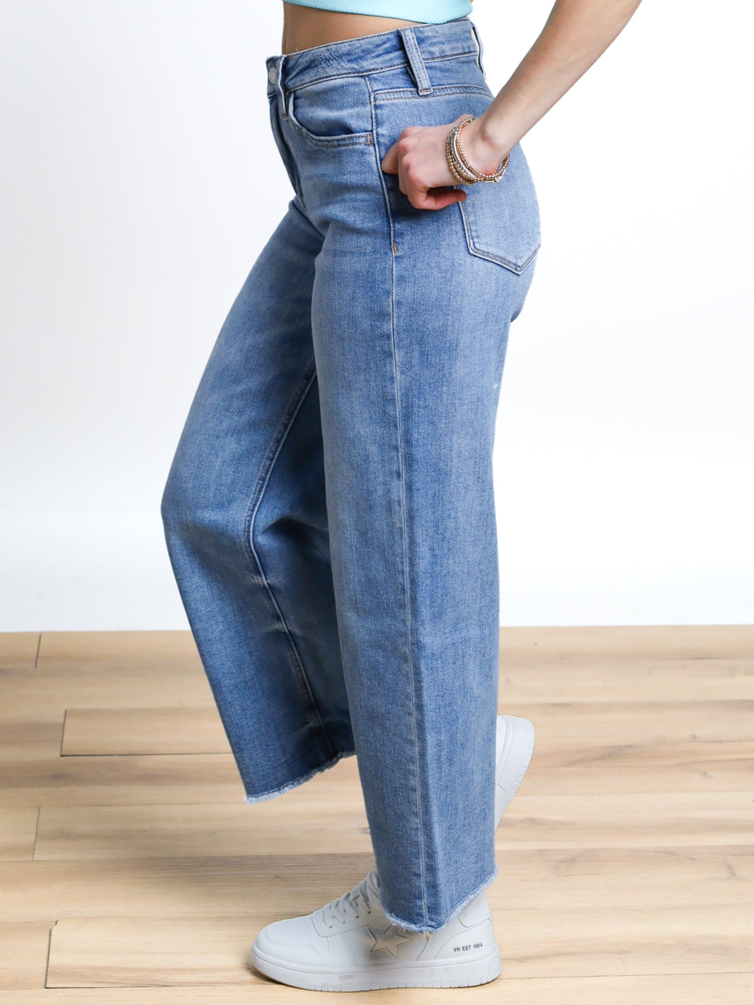 Introducing the Olivia Super High Rise Wide Leg Jeans in medium wash. These jeans feature a super high rise and wide leg fit for a flattering silhouette. The button and zipper front closure and 5-pocket detail add functionality to this stylish pair. Crafted from VERVET denim, these jeans will be your new go-to denim.