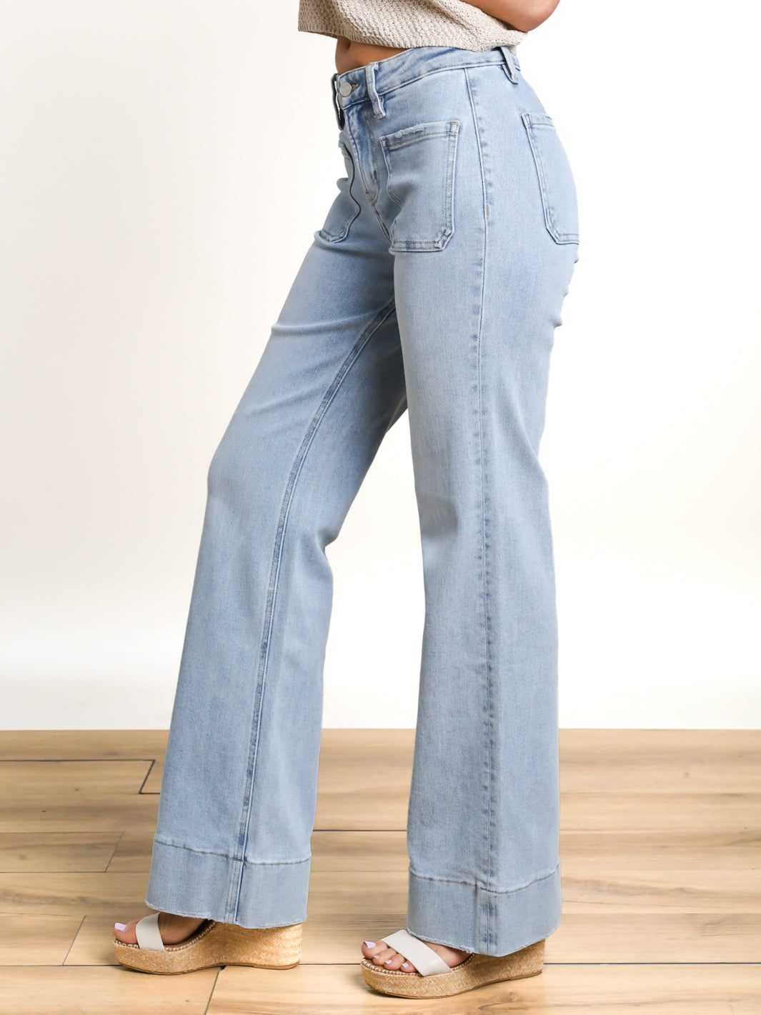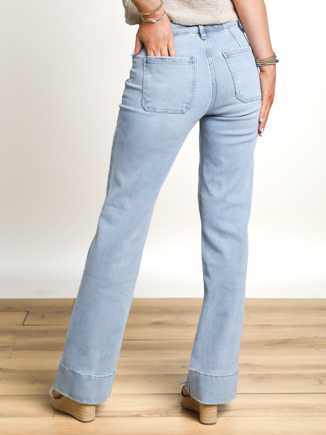 Get ready to make a stylish statement with our Trina High Rise Trouser Hem Flare Jeans! These light wash denim jeans feature a high rise fit and a trendy flare hem, perfect for pairing with your favorite tops. The button and zipper front closure and pockets add both functionality and flair. Try them out today and elevate your denim game with VERVET!