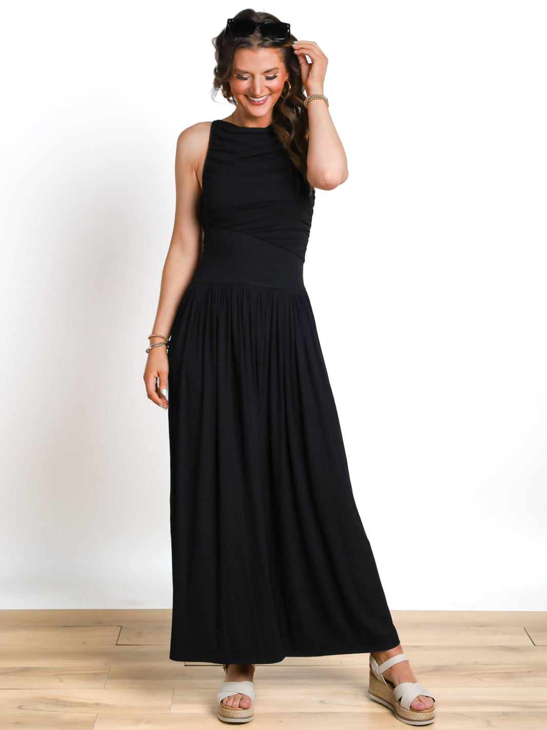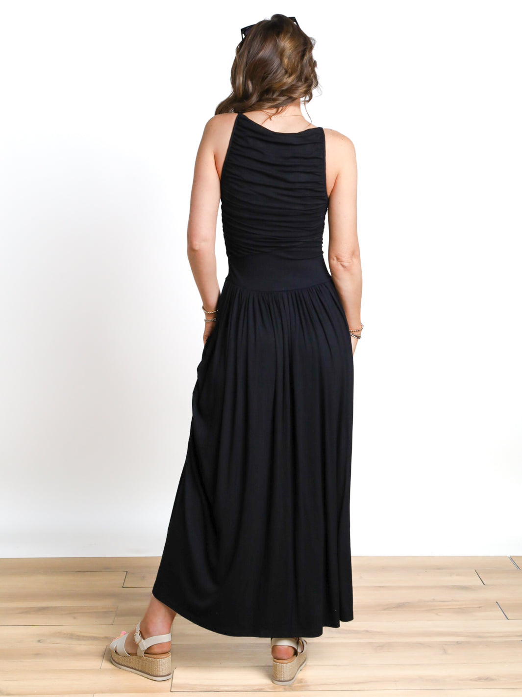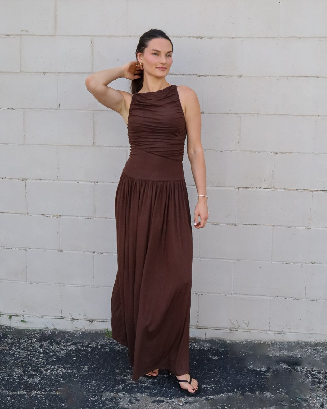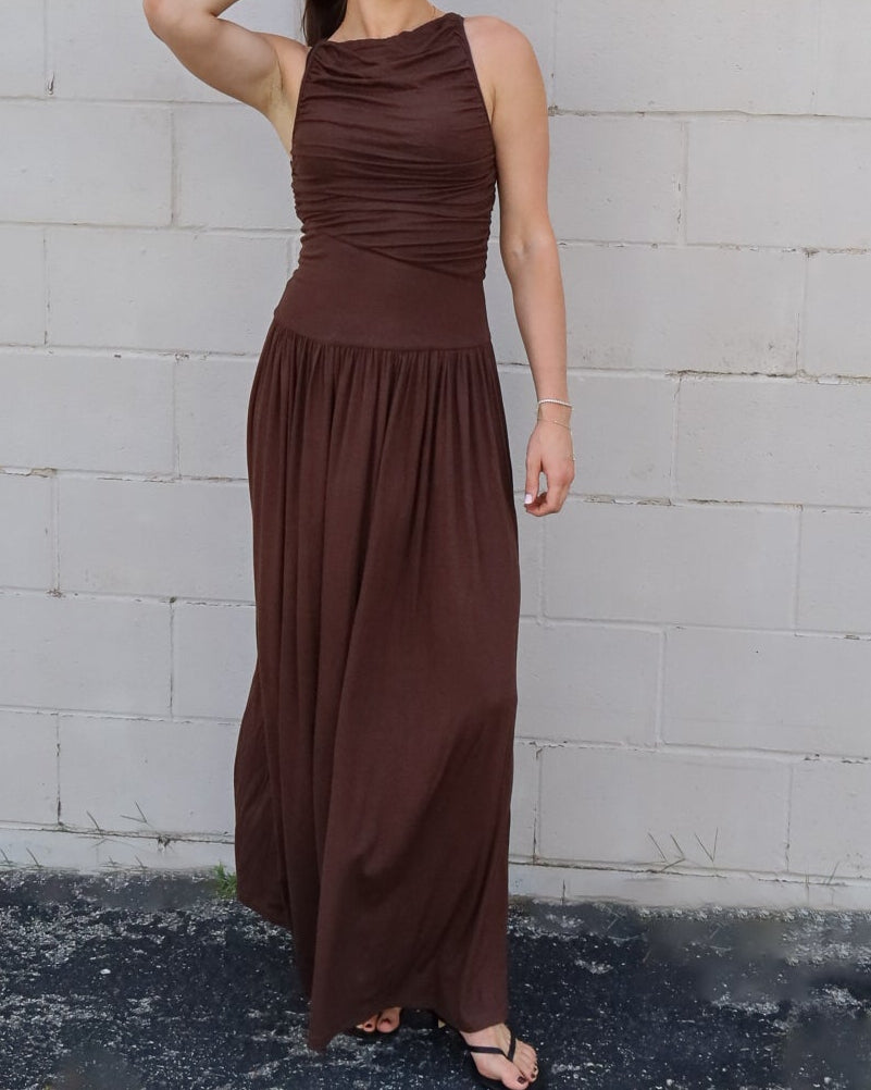 Delicate Hue High Neck Ruched Maxi Dress