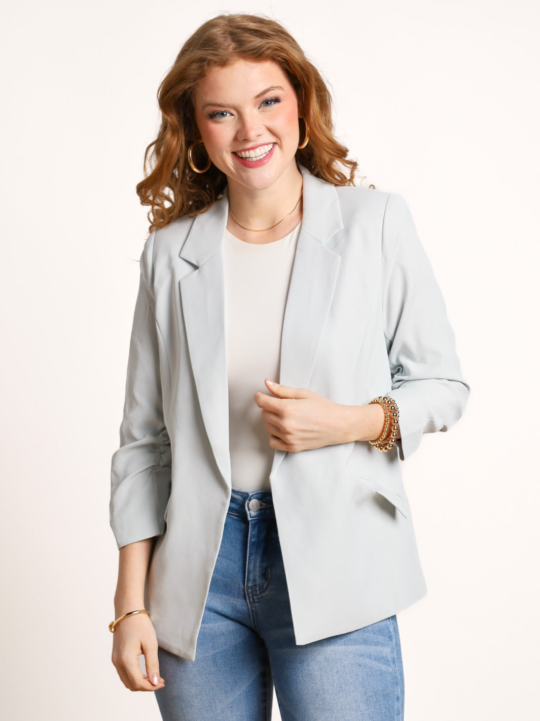 Model is wearing a dove gray scrunch sleeve blazer. Model is wearing a dove gray scrunch sleeve blazer.