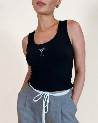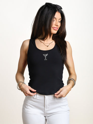 Sip in style with our Sunset Sips Embroidered Martini Glass Tank. This playful tank features a black knit design with a quirky embroidered martini glass, making it the perfect addition to your summer wardrobe. Sleeveless and scoop neck for a comfortable and chic look. Cheers to that!