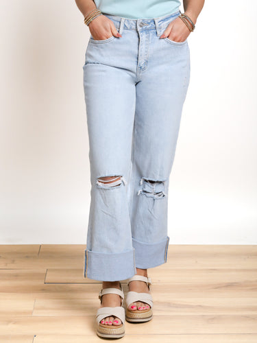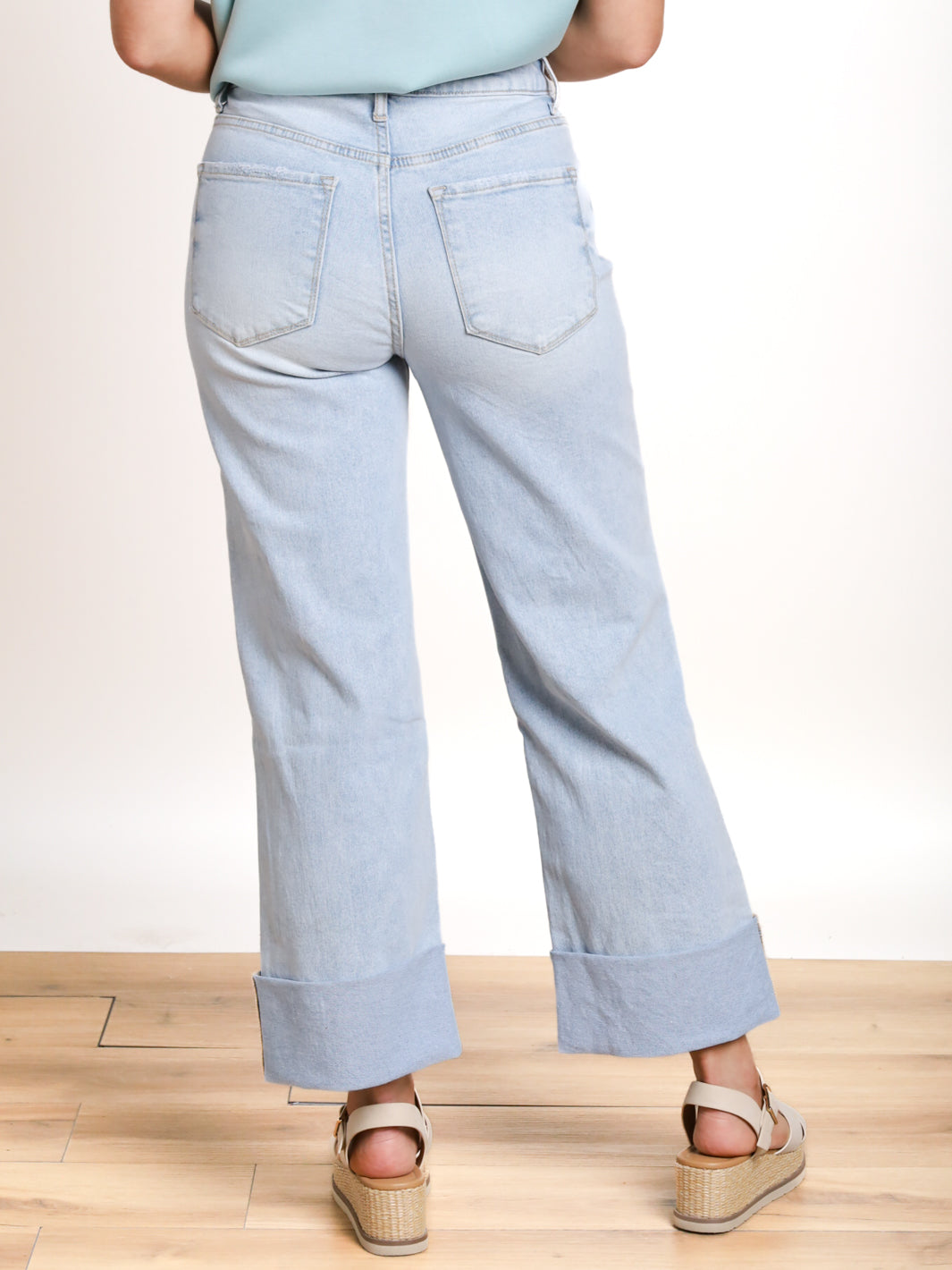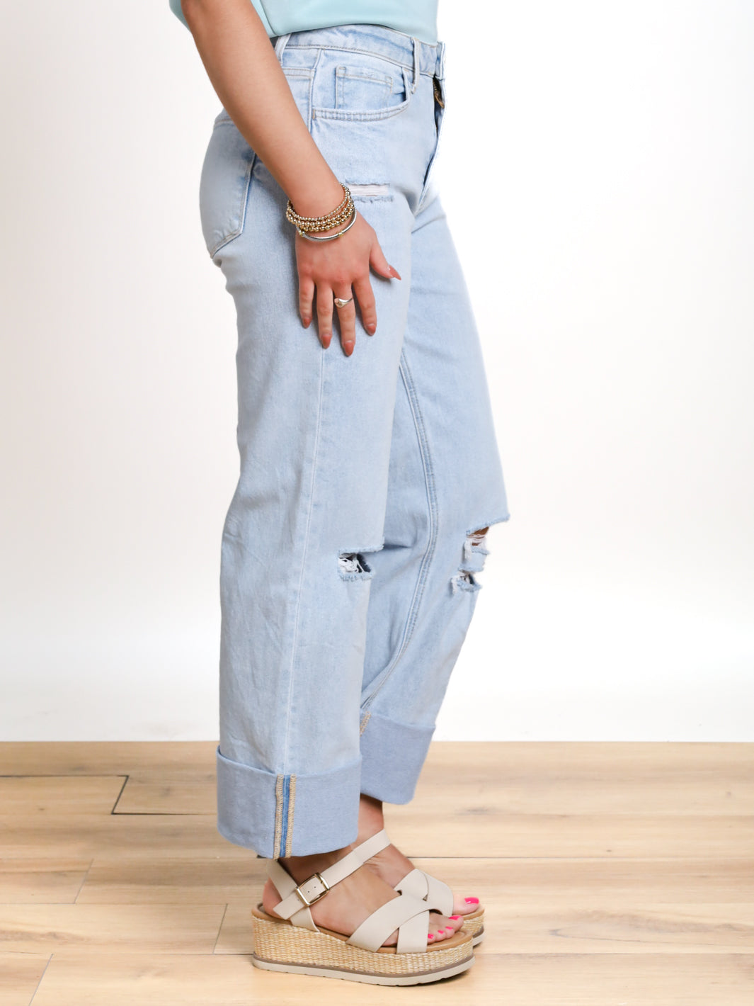 Introducing the Tate Super High Baggy Cuffed Wide Leg jeans from LOVERVET. These light wash denim jeans feature a high rise, baggy fit, and cuffed wide legs for a unique and stylish look. With knee distressing, button and zipper closure, and pockets, these jeans are both fashionable and functional.