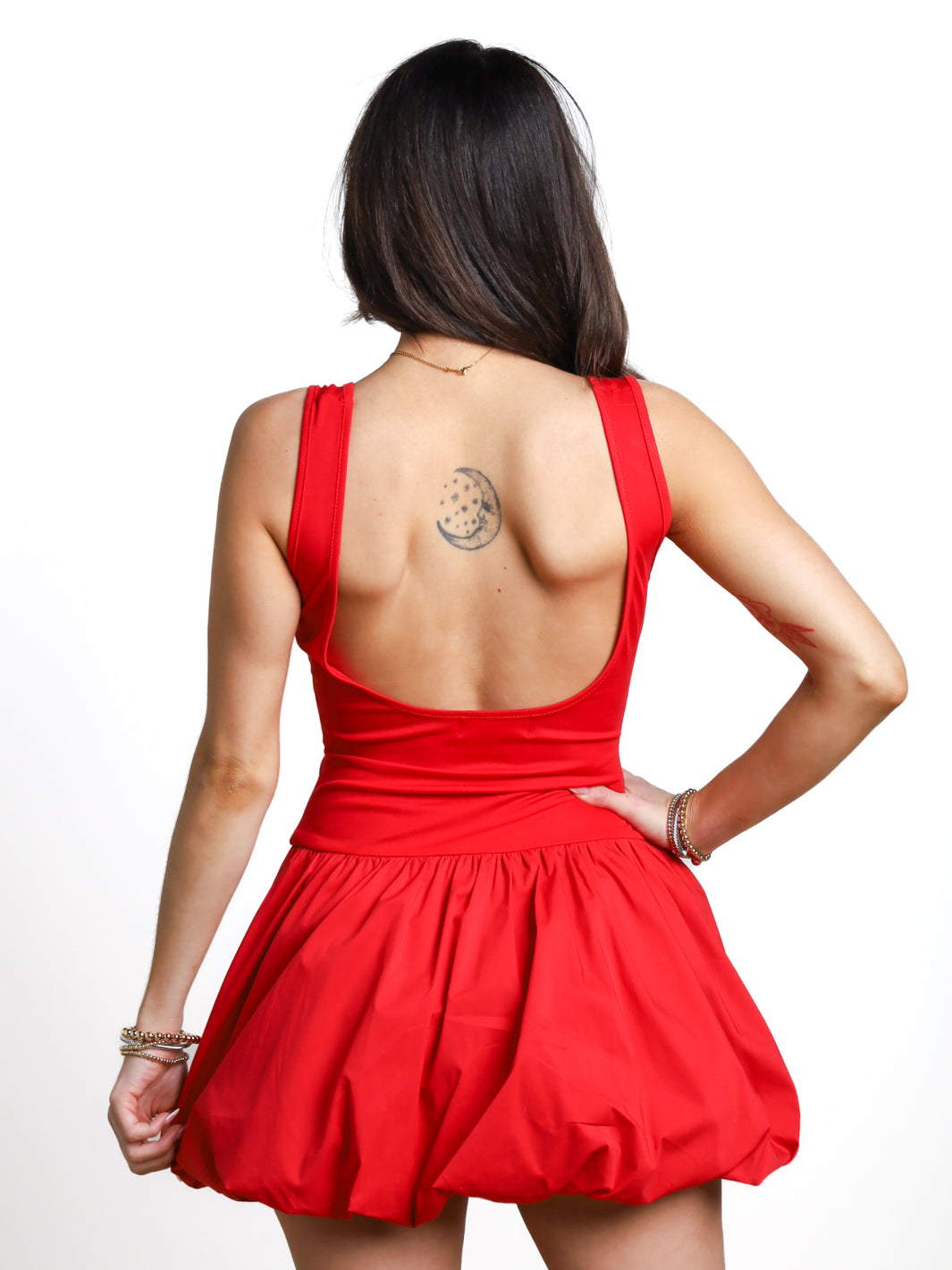 Get ready to turn some heads with our Tell Me Everything Bubble Bottom Dress. This bright red mini dress is a playful and chic addition to your wardrobe. With a unique bubble bottom and convenient pockets, you'll have all the space you need to carry your essentials while looking effortlessly stylish. Sleeveless for a sleek look. Go ahead, tell us everything.