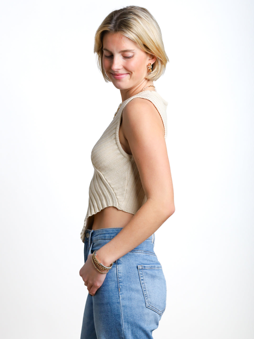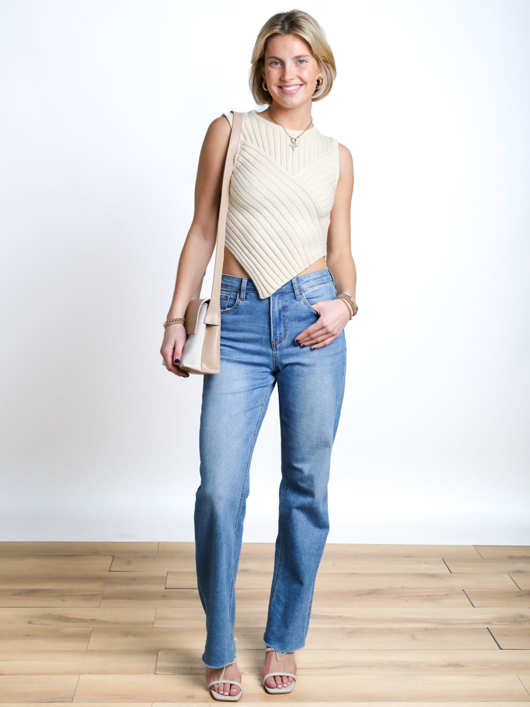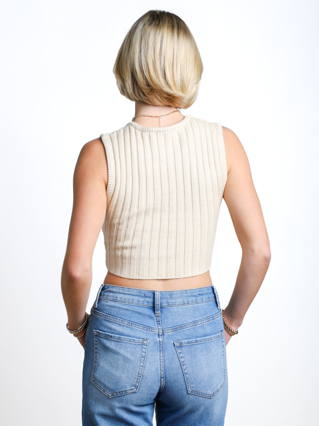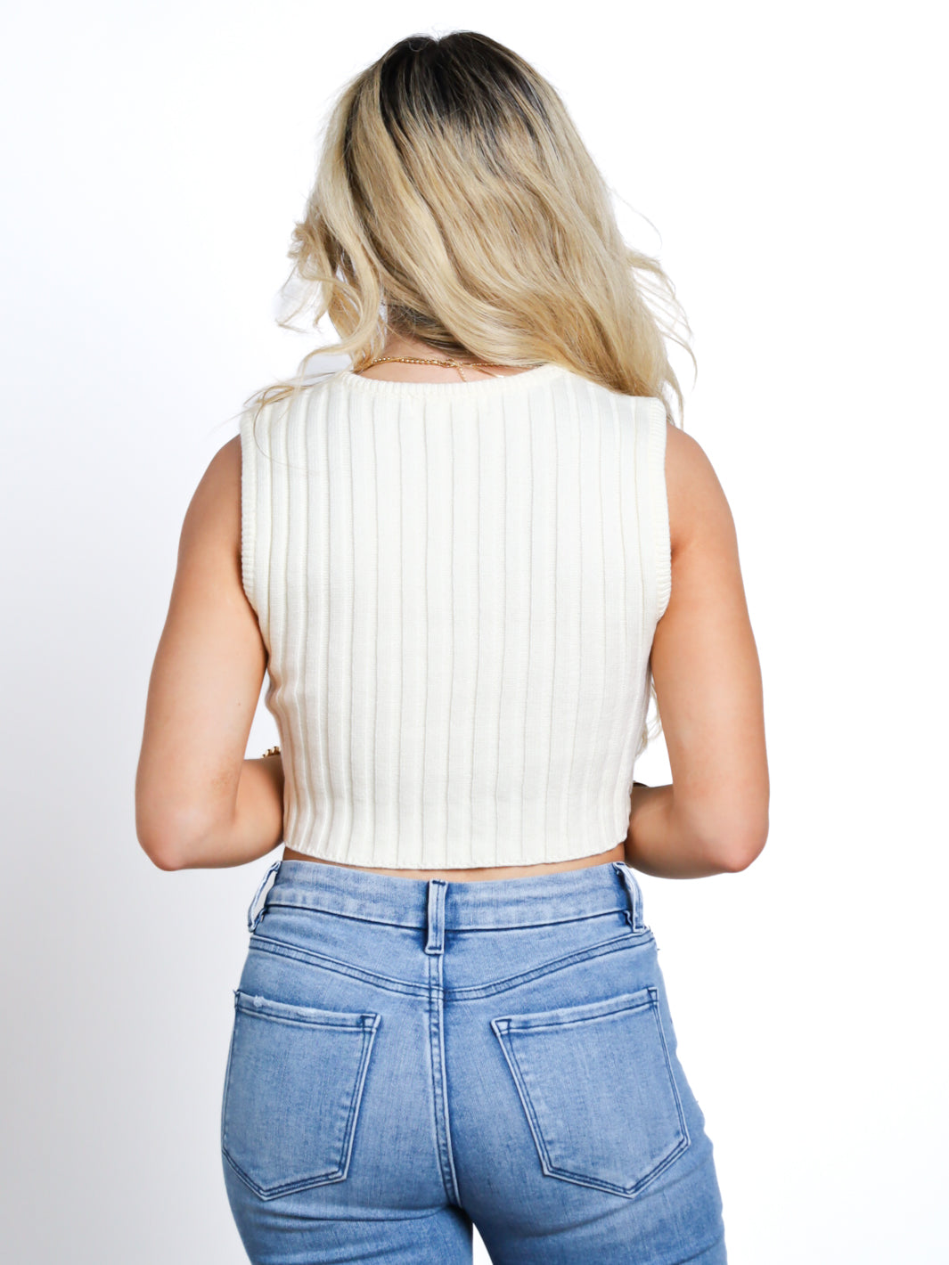 Lighten up your winter wardrobe with our Unapologetic Sleeveless Sweater. This white knit sweater features a quirky scarf hem and a comfortable round neckline. Stay stylish and cozy without sacrificing your playful side.
