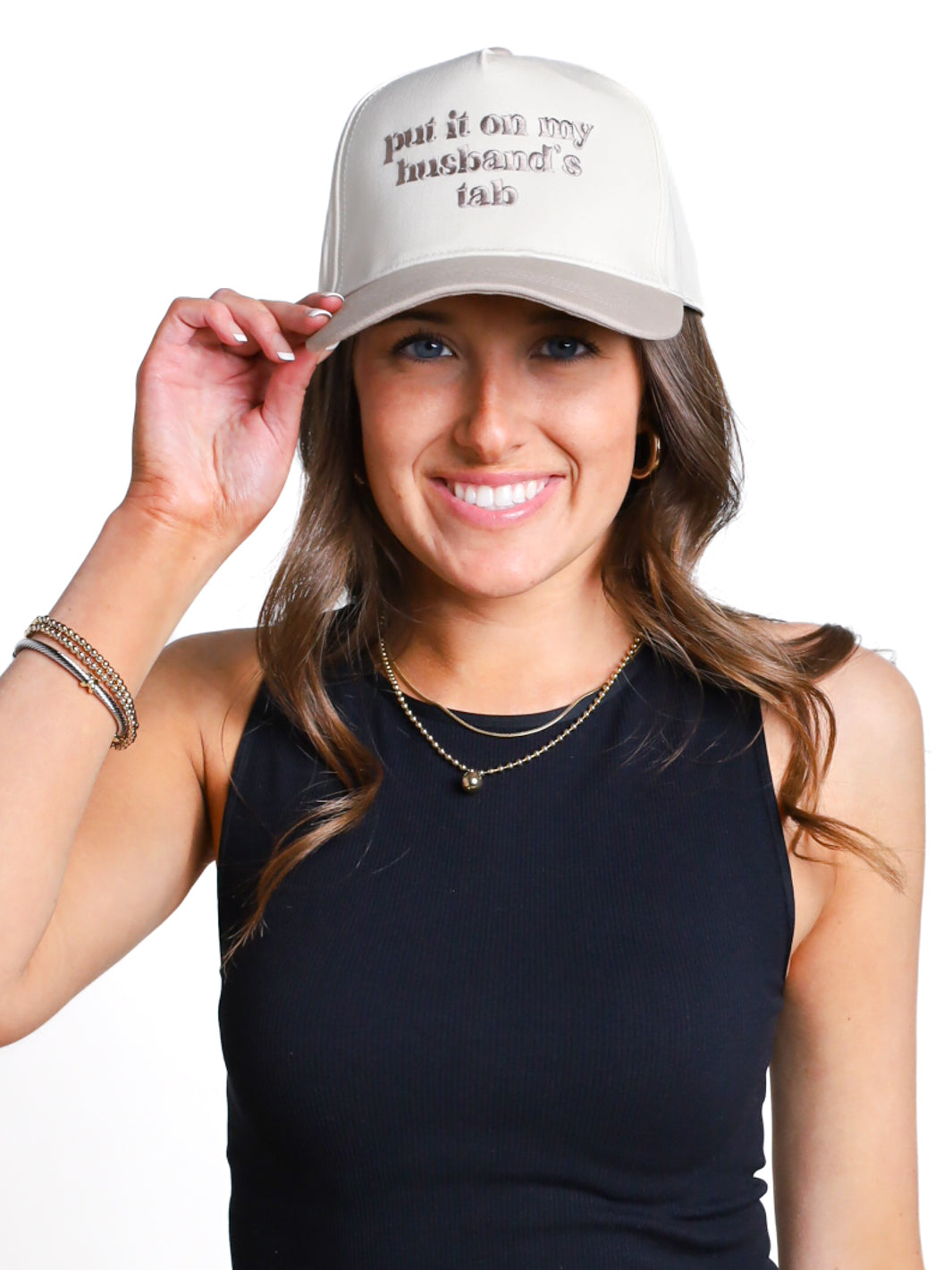 Add a playful touch to your wardrobe with our Put It On My Husband's Tab Hat. Available in beige or pink, each hat features a cheeky "put it on my husband's tab" embroidery. Perfect for sunny days and cheeky attitudes. Get yours now!