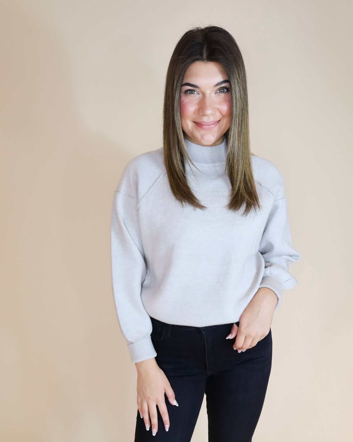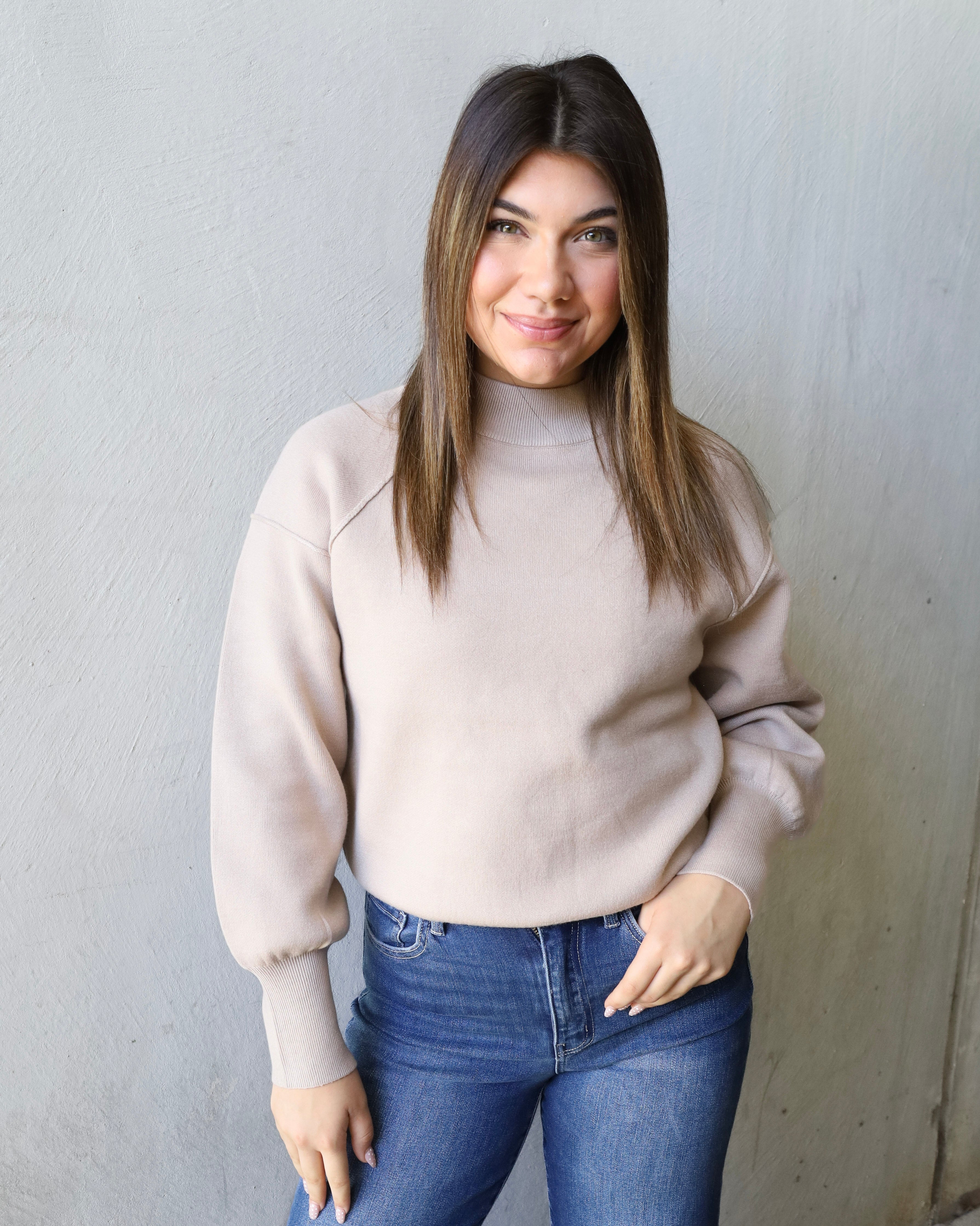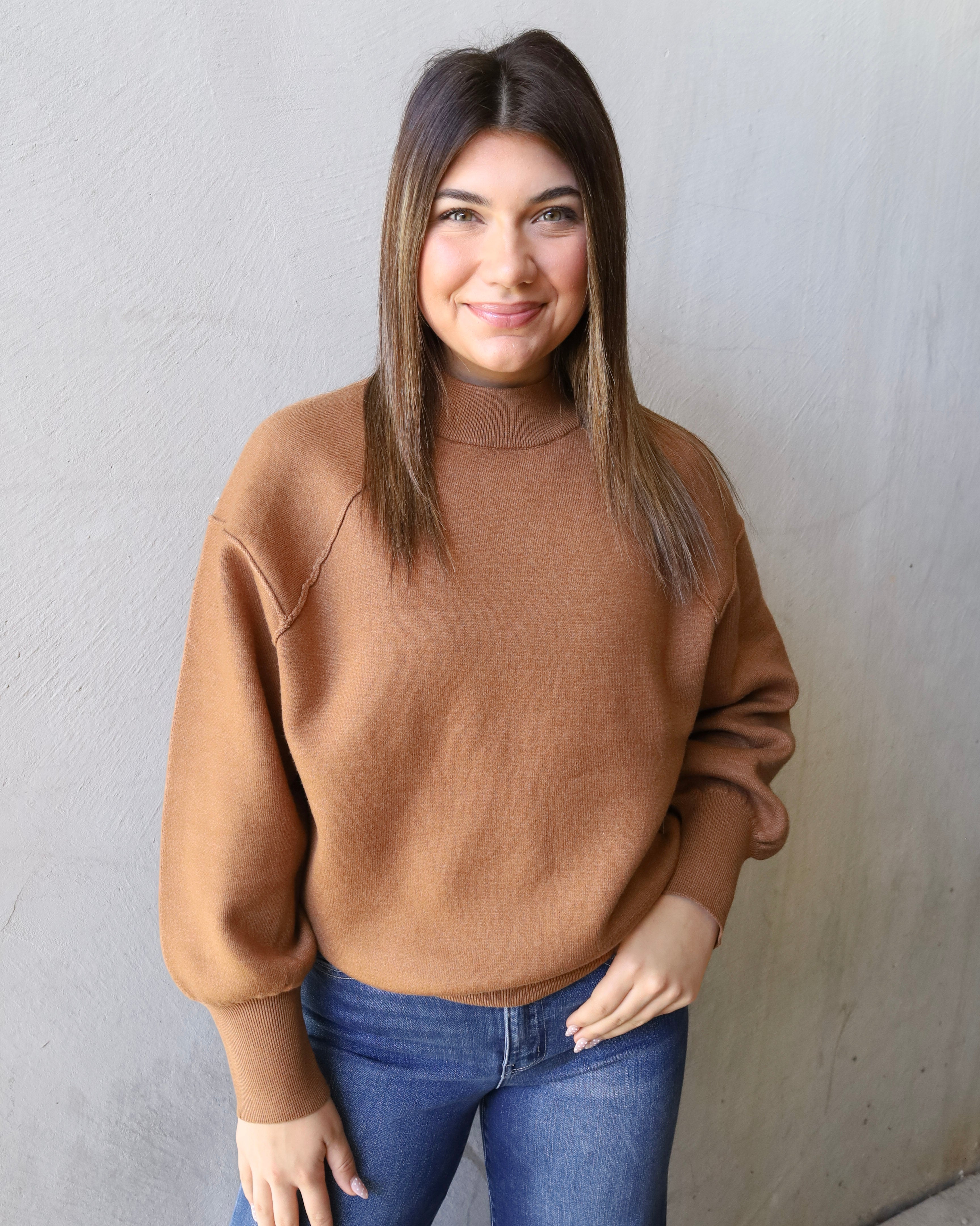 Elevate your wardrobe with this sophisticated Mock Neck Exposed Seam Sweater, designed with subtle bubble sleeves that add a refined silhouette. The banded bottom ensures a tailored fit, balancing comfort with polished elegance. Perfect as a standalone piece or layered for added dimension, this sweater combines timeless style with modern detailing for a versatile, elevated basic.