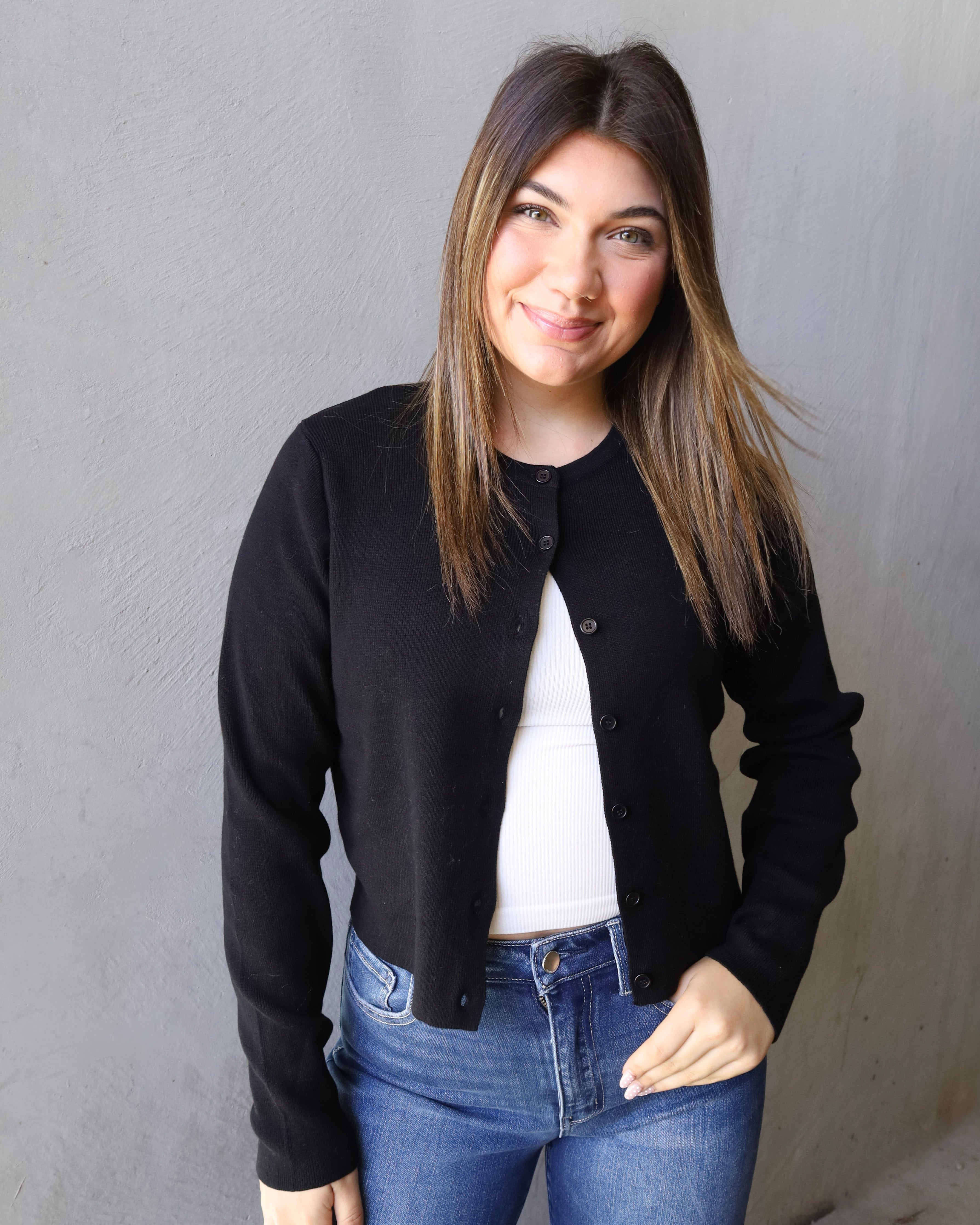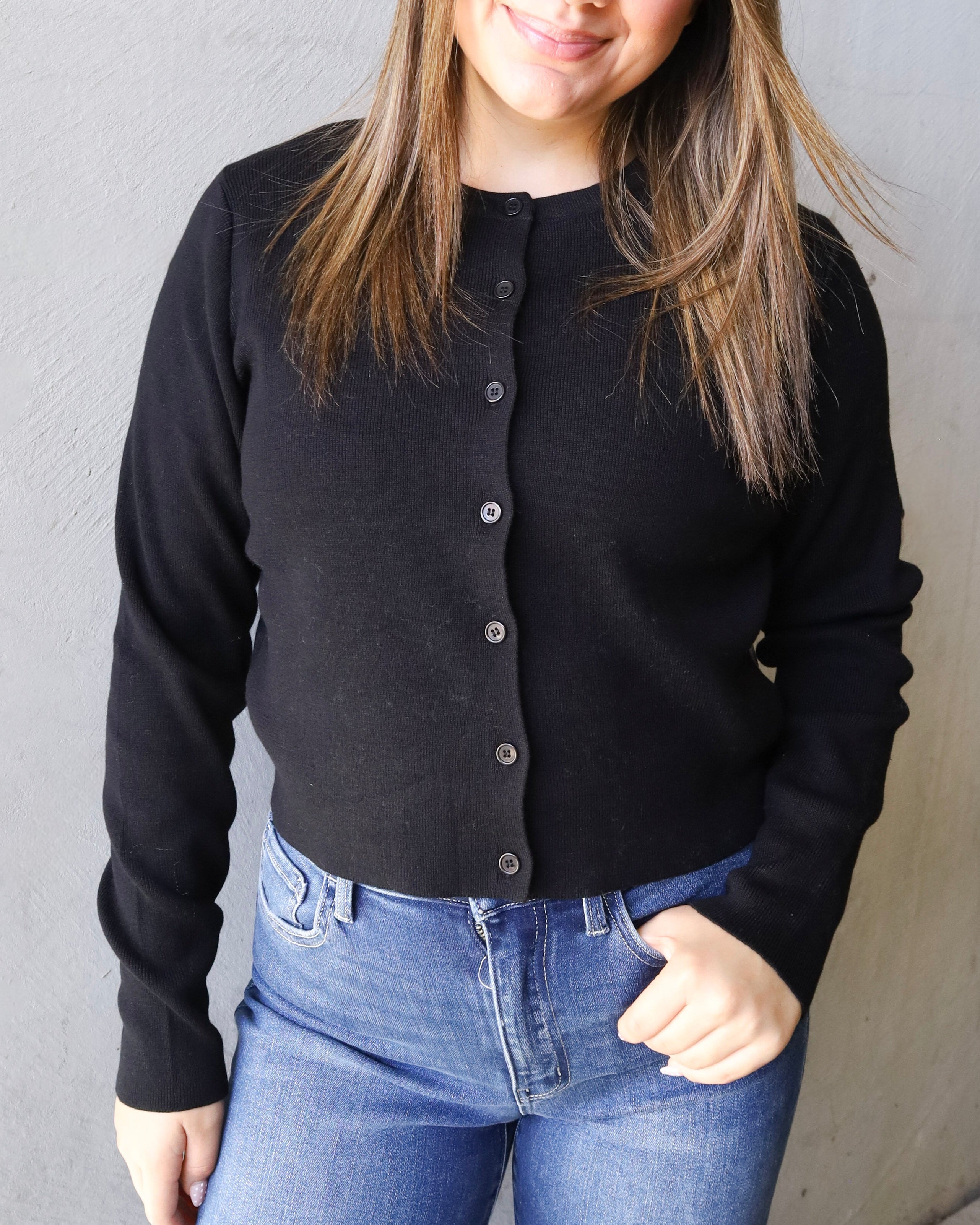 Stay chic in the office with our crewneck long sleeve cardigan, available in black or sand beige. With a button front and comfortable fit, this cardigan is both stylish and professional. Perfect for layering over your favorite work outfit!