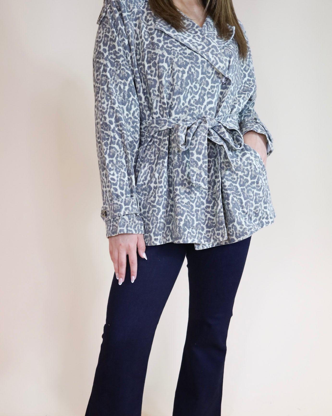 This playful belted mini trench coat brings a wild twist to classic style with its bold animal print on stretch denim. The adjustable belt hugs your waist for a flattering fit, while the soft, stretchy fabric ensures comfortable all-day wear. Perfect for adding a fierce edge to any outfit, this jacket turns heads wherever you go.