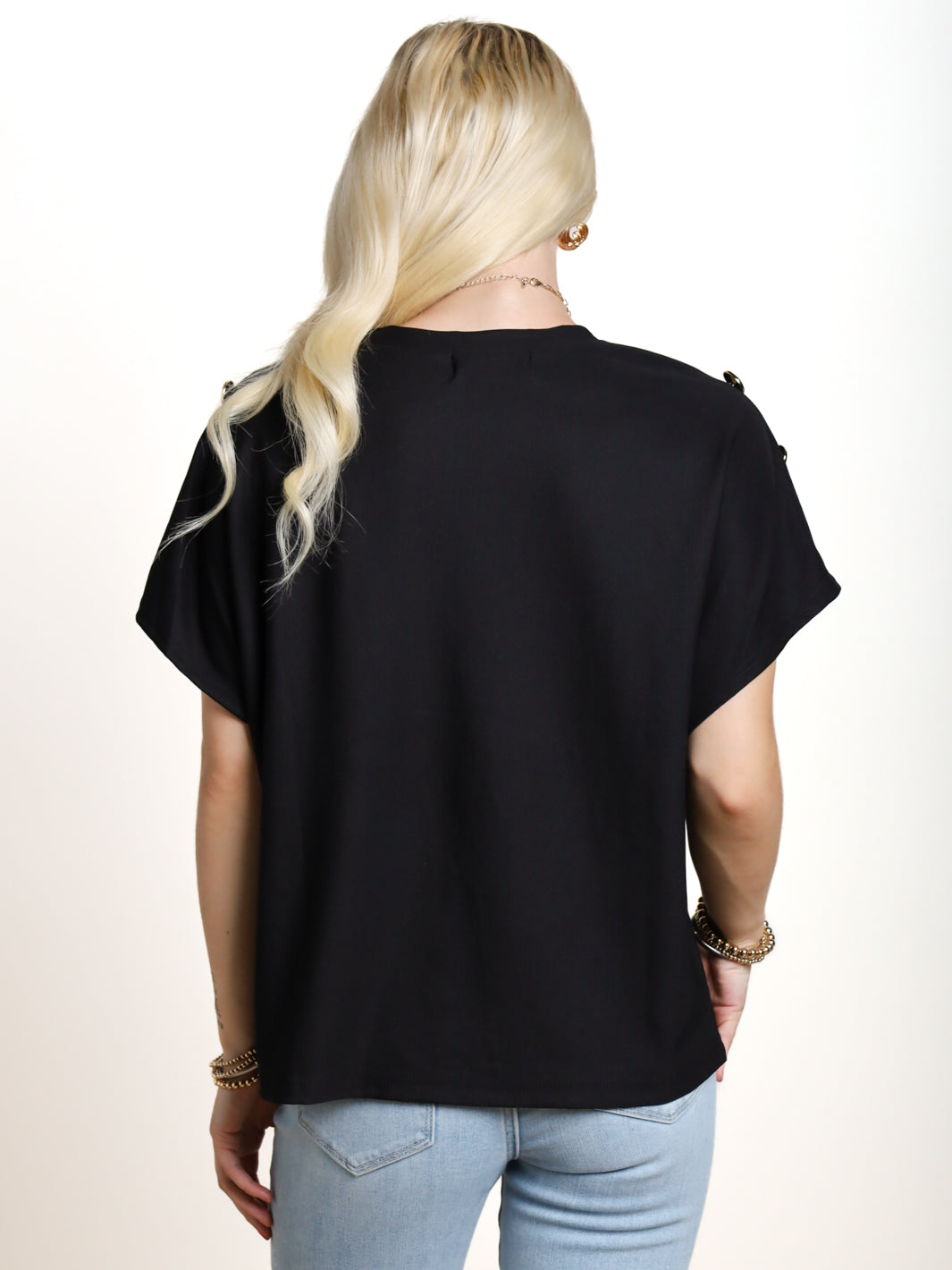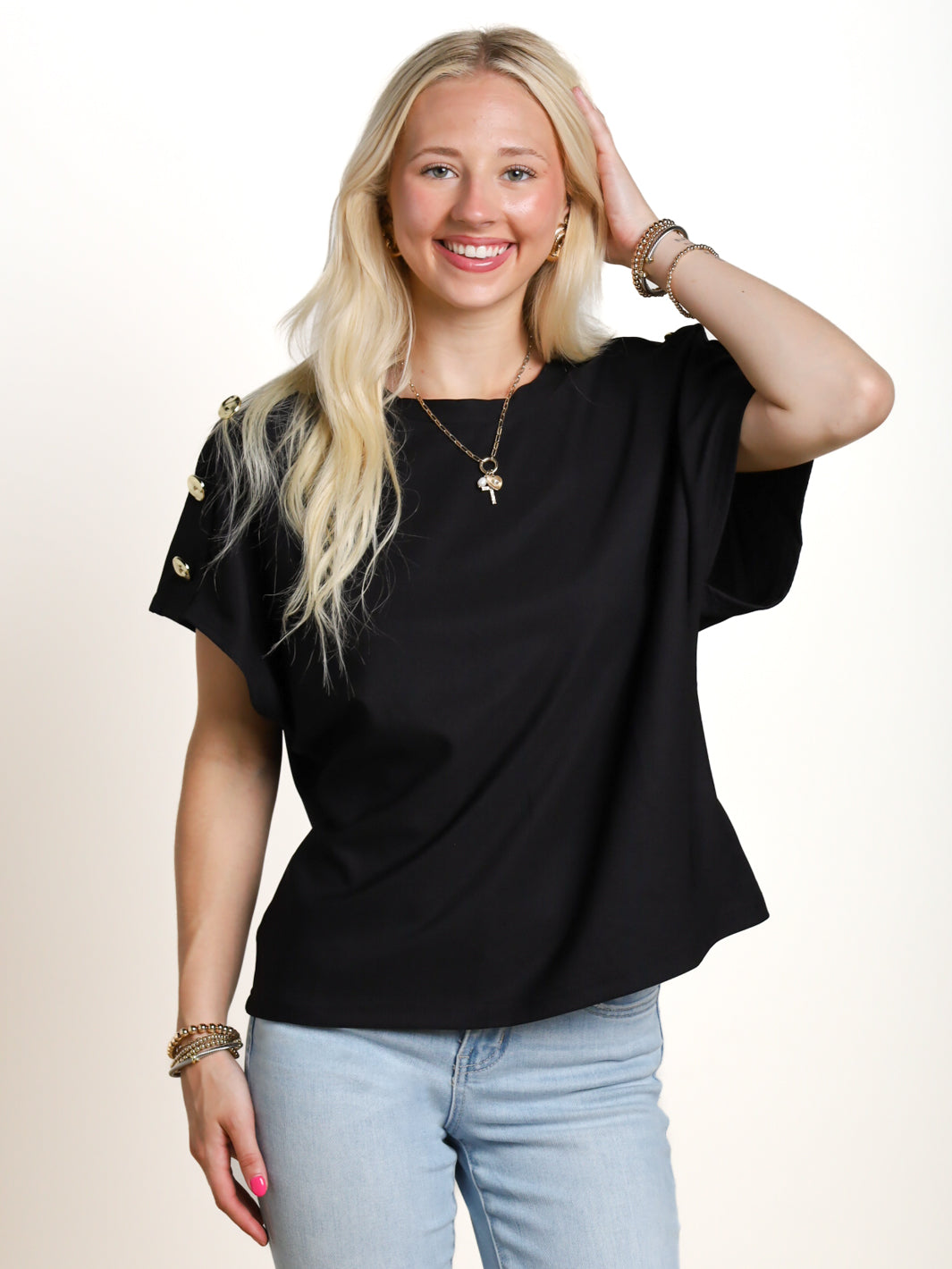 This playful ribbed short sleeve tee features charming gold buttons along the shoulder, adding a touch of sparkle to your everyday look. Soft and stretchy, it’s perfect for mixing and matching while keeping things effortlessly stylish.