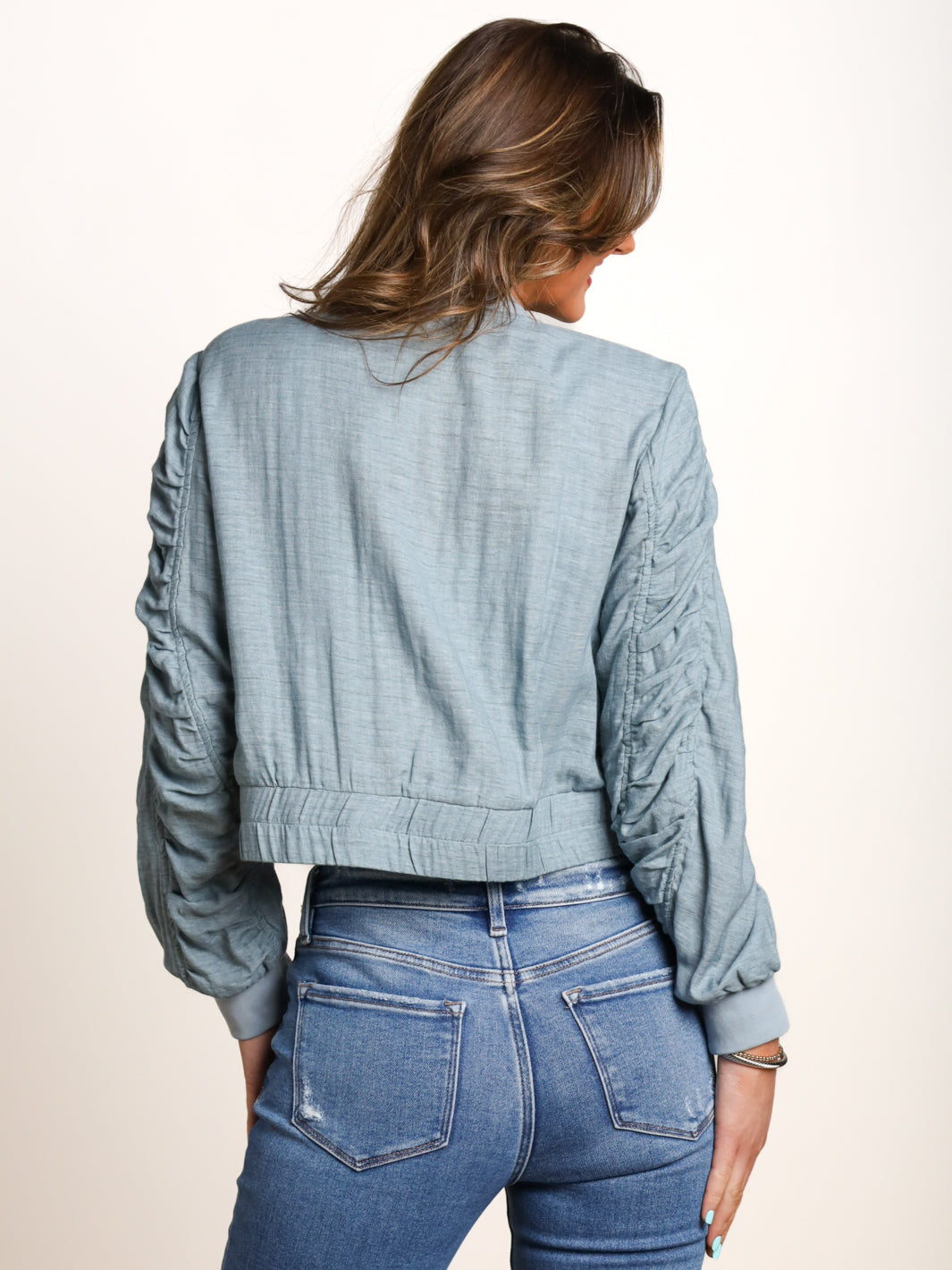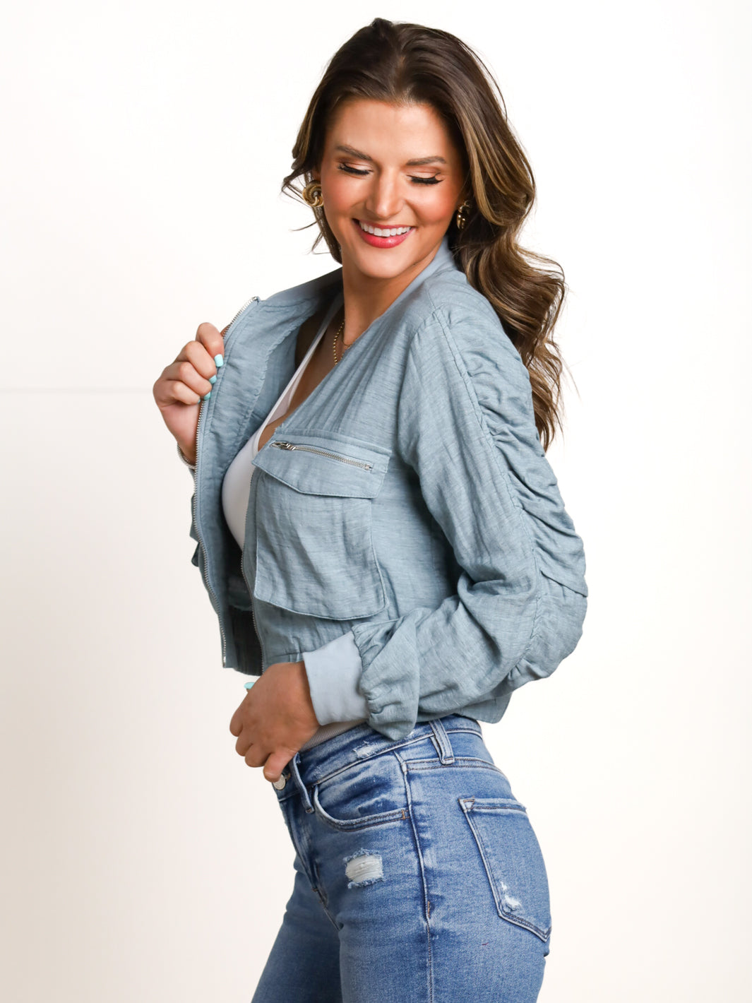 Charmingly Yours Ruched Sleeve Linen Bomber Jacket