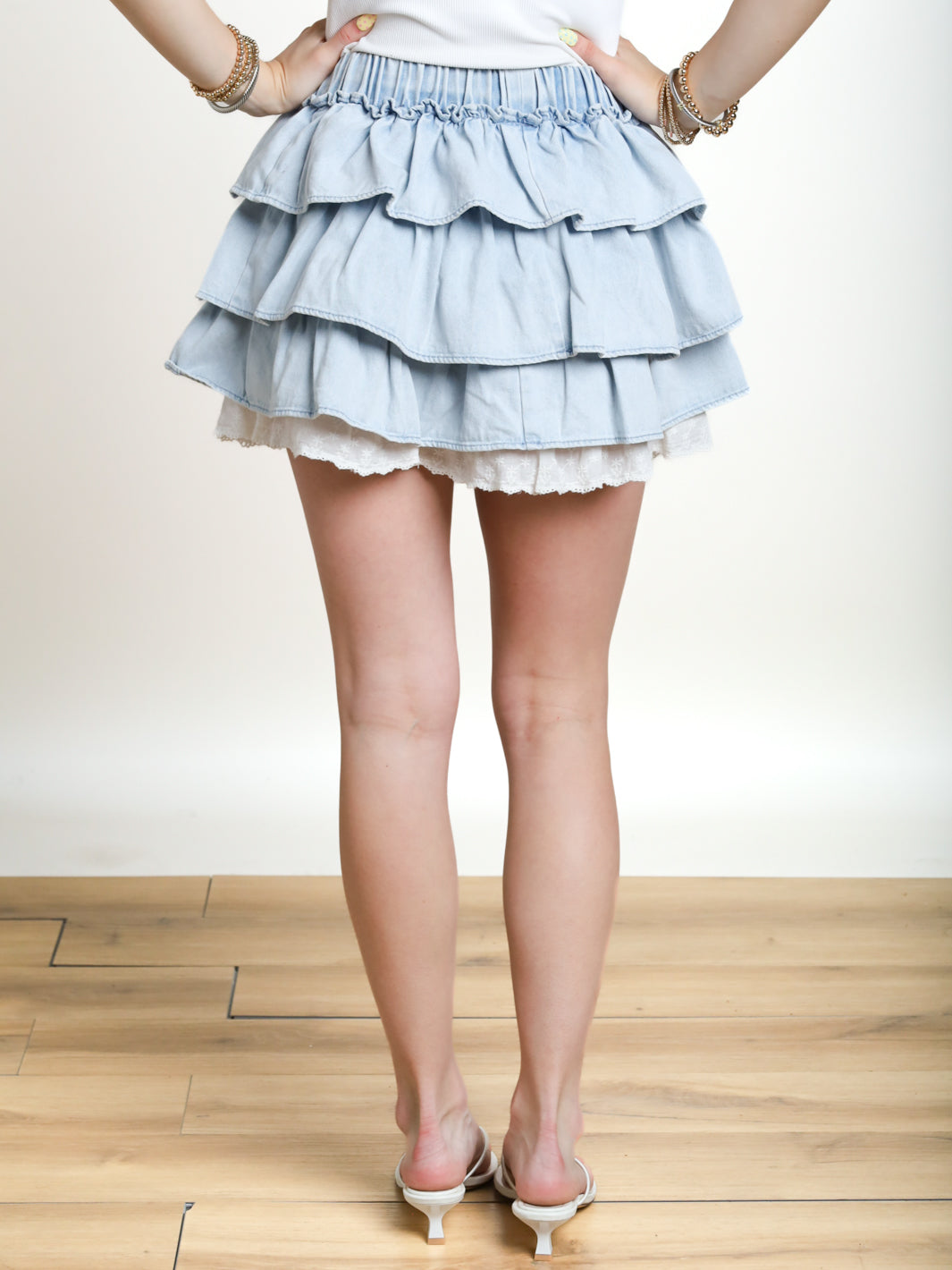 Twirl through sunny days in our Countryside Charm Ruffle Tiered Skirt! This light denim skirt features playful tiers of ruffles and delicate lace trim along the bottom edge. The comfortable elastic waistband ensures a perfect fit while you frolic through fields or enjoy casual outings. A whimsical addition to your warm-weather wardrobe!