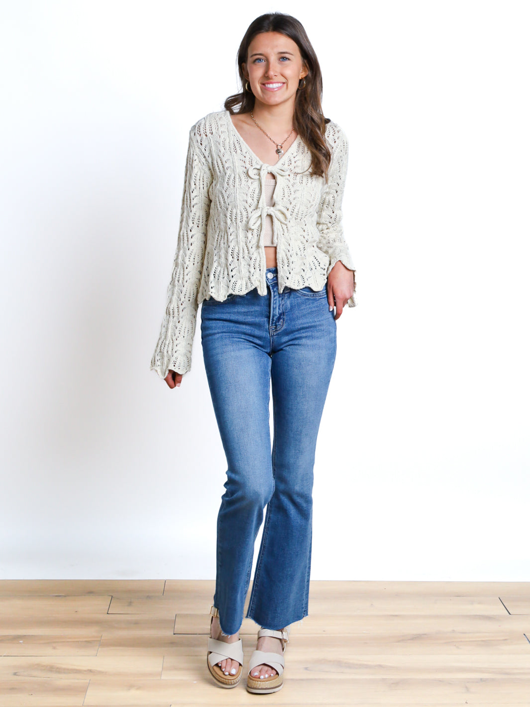 This cream cardigan is destined to be your new favorite! With its open knit design and tie open front, it's perfect for layering over any outfit. Stay cozy and stylish with the long sleeves.