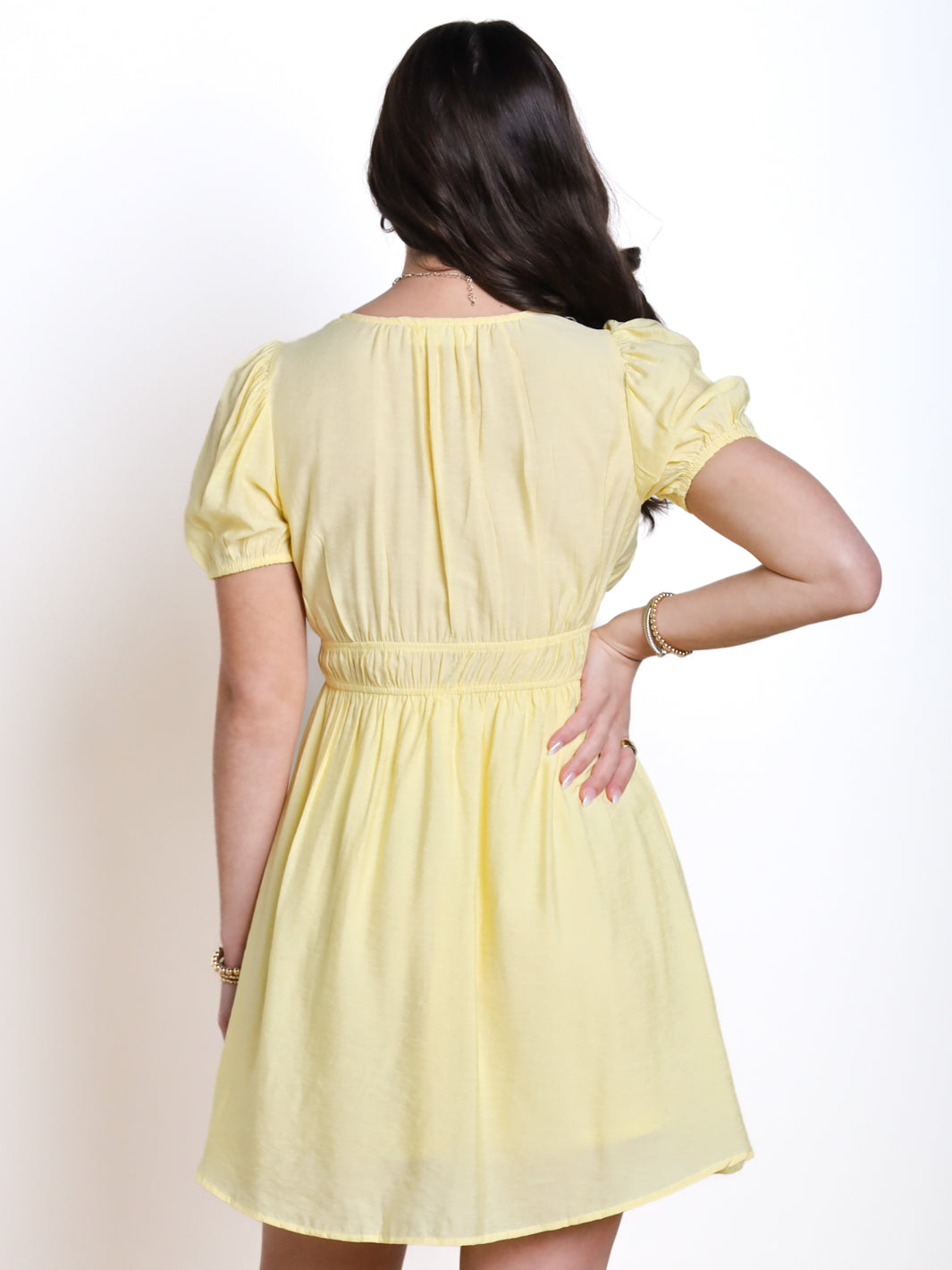 Add a playful pop to your wardrobe with our Express Yourself Puff Sleeve Dress. Available in yellow or off white, this mini dress features trendy puff sleeves and a front tie detail. Perfect for making a statement with a touch of quirkiness.