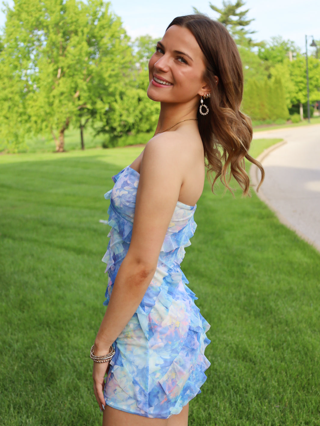 Get ready to turn heads in the Garden Glow Strapless Dress. With a blue multi floral print and mesh ruffle layer, this strapless dress is perfect for any occasion. Lined for comfort, it's also a slip on - making it easy to wear and go.