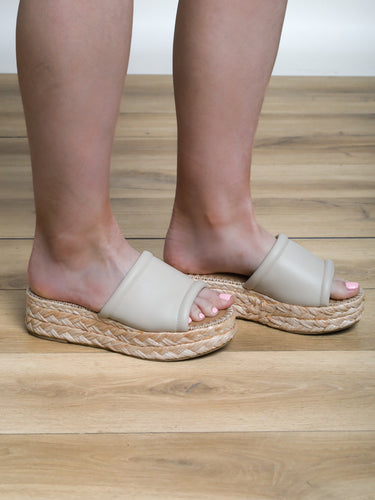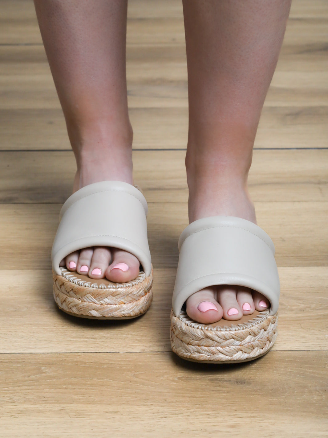 Get ready to step into style with our Golden Escape Stitch Detail Platform Sandal. These natural tan woven sandals not only give you a comfortable platform, but the stitch detail adds a touch of uniqueness. The bone wide toe strap and rounded toe complete the look. Say goodbye to boring footwear!