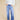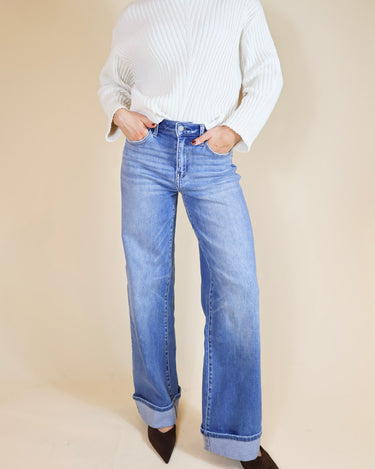 - Comfort stretch denim, high rise waist, lightly distressed detail, fixed bar tack single cuff hem, full length, wide leg jeans