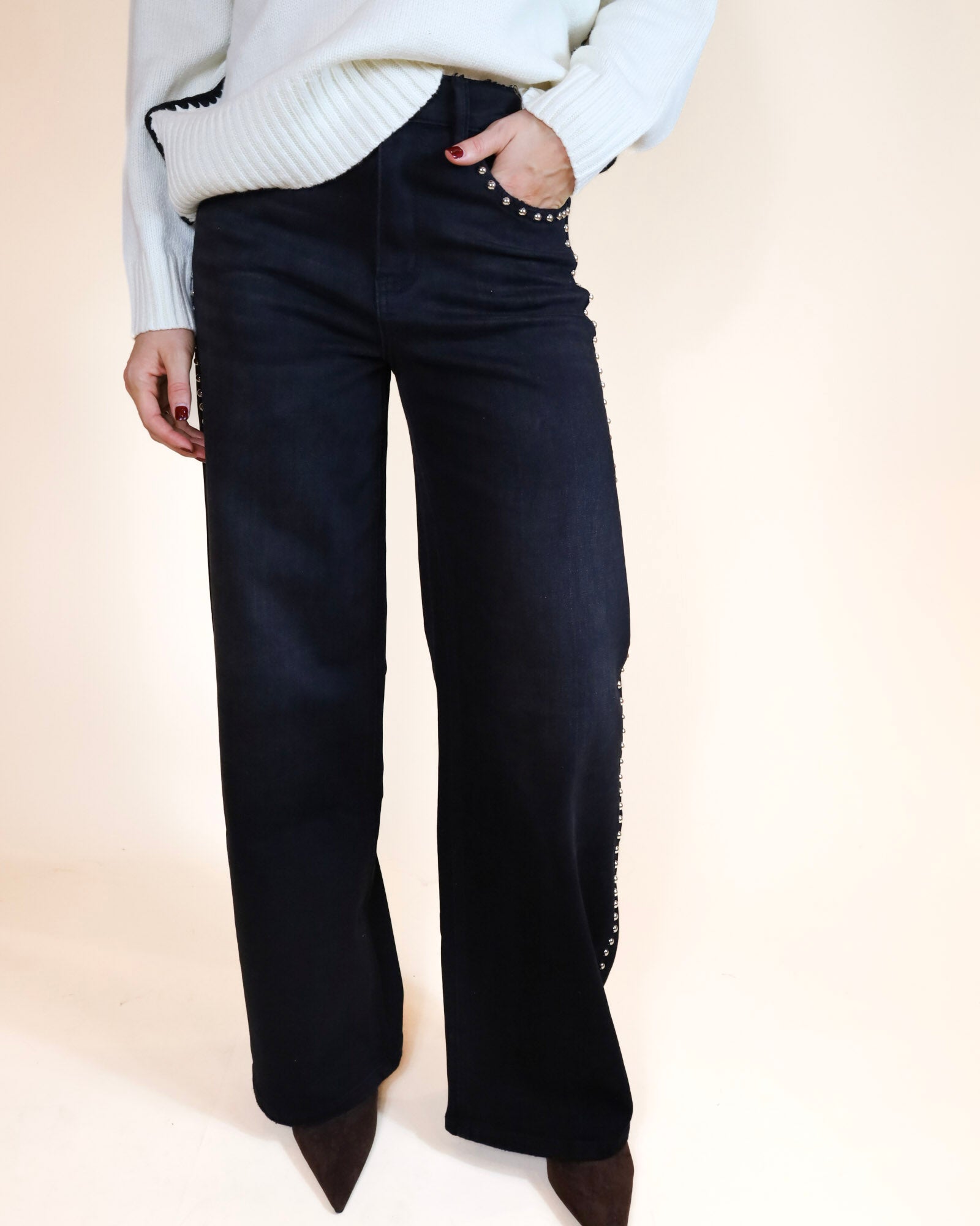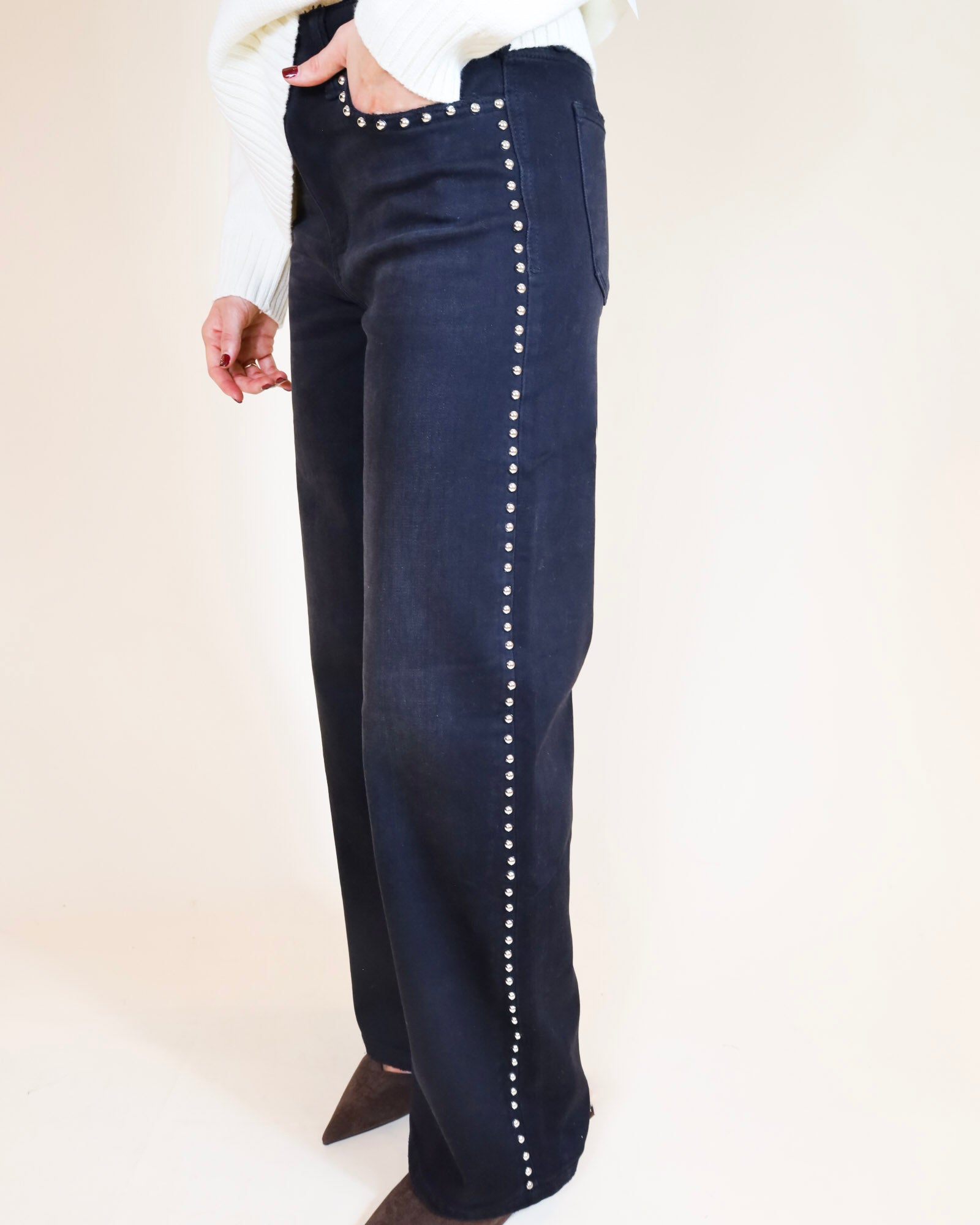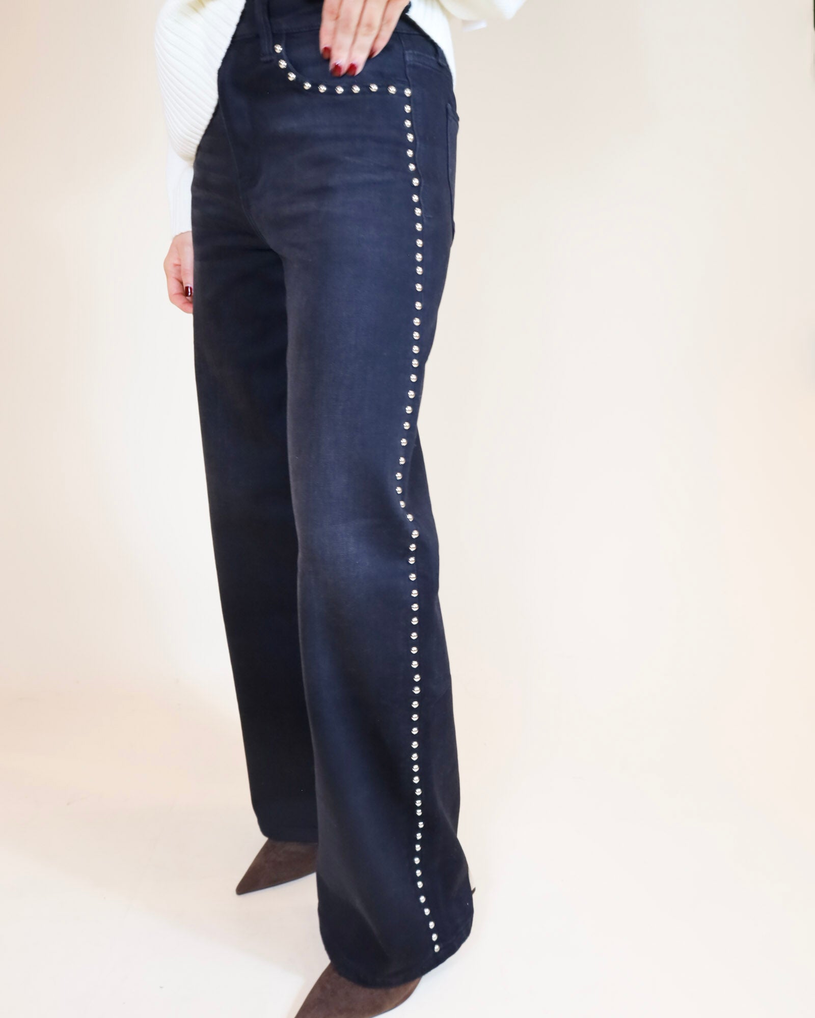 - Step out in Western-inspired style in mid-rise, wide-leg jeans made from low-stretch denim and accented with silvery studs.