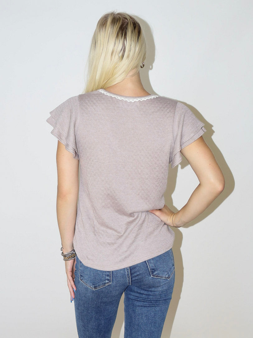 Add a flirty touch to your wardrobe with this Lace Trim V-Neck Top. Its relaxed fit and soft knit fabric make it perfect for all-day comfort, while the delicate lace trim adds a playful, feminine flair. Whether you're dressing up or keeping it casual, this top brings effortless charm to any outfit.