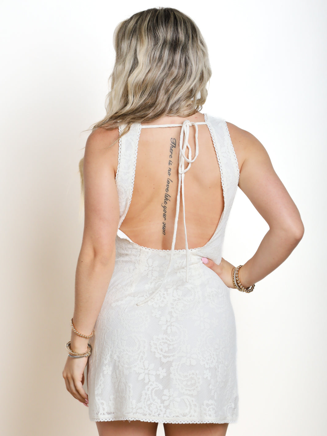 This ivory beauty features a flirty V-neck and an open back tied with delicate detail, perfect for turning heads. Crafted from intricate lace, it blends elegance with a playful twist, making it your go-to for special occasions or a night out.
