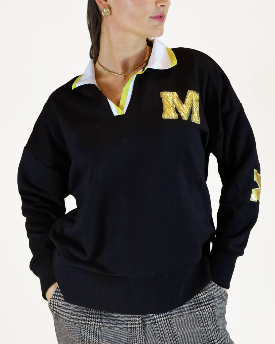 Team lettering across the back of the sweatshirt in fabric appliqué with embroidery
