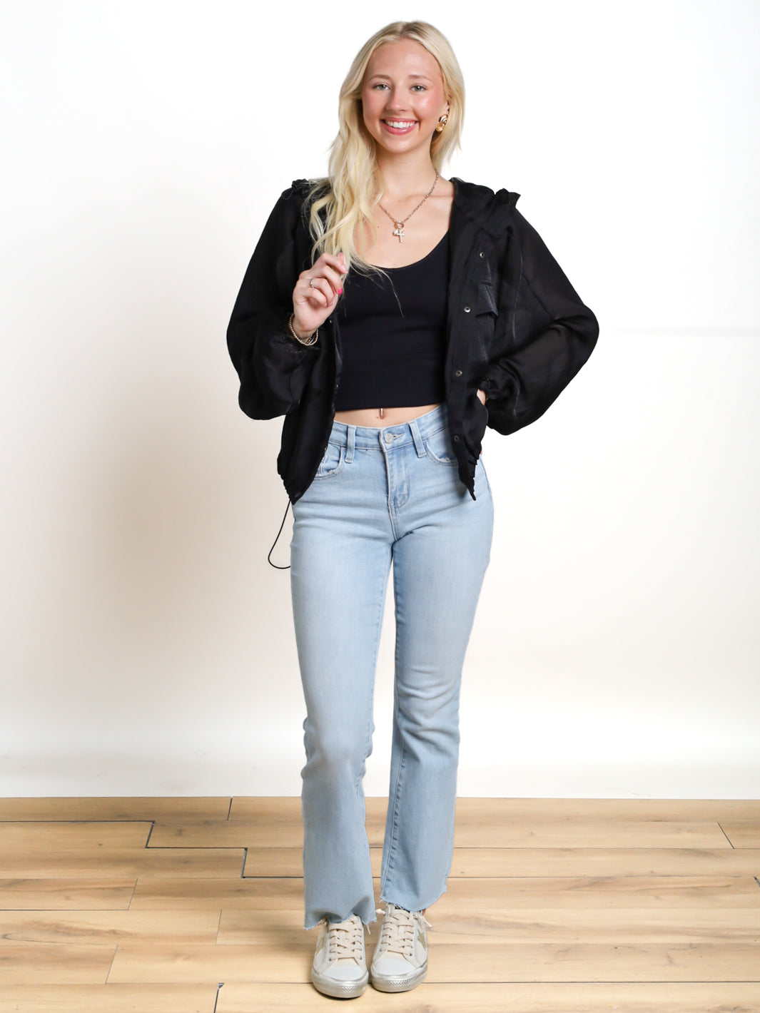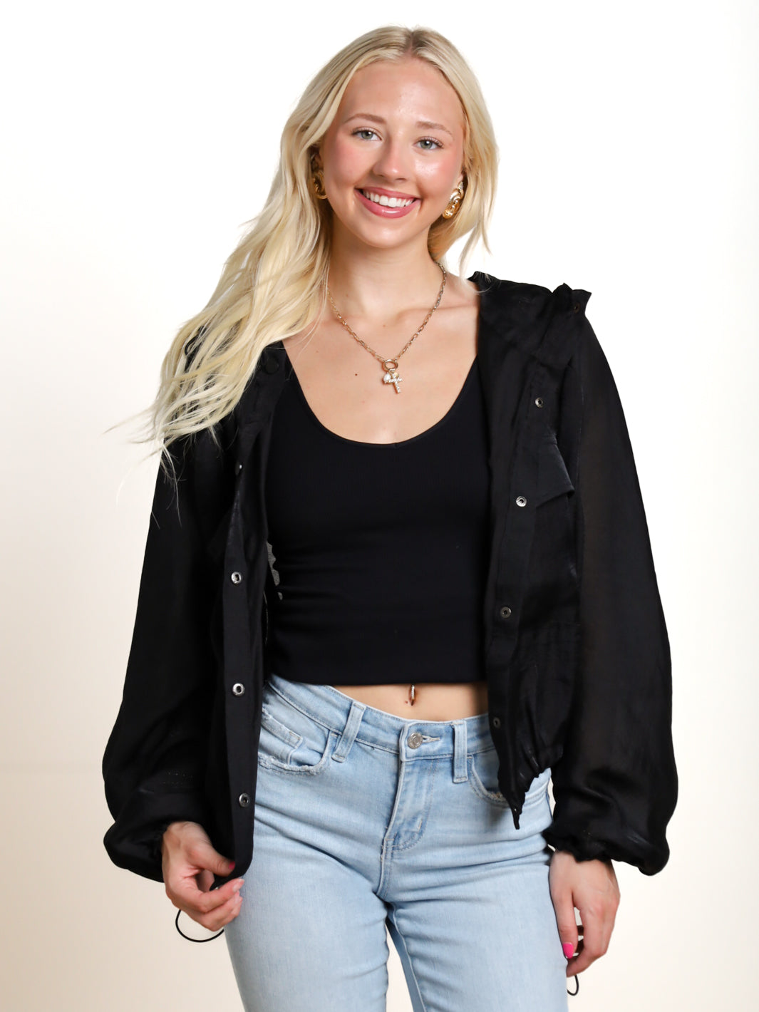 Stay effortlessly stylish with the No Regrets Pocket Front Cinched Light Weight Jacket! This playful jacket features a cinched front for a flattering fit, two handy front pockets, and a snap button closure for easy wear. The attached hood adds a fun, casual vibe while keeping you ready for any weather. Perfect for layering on breezy days without the bulk!
