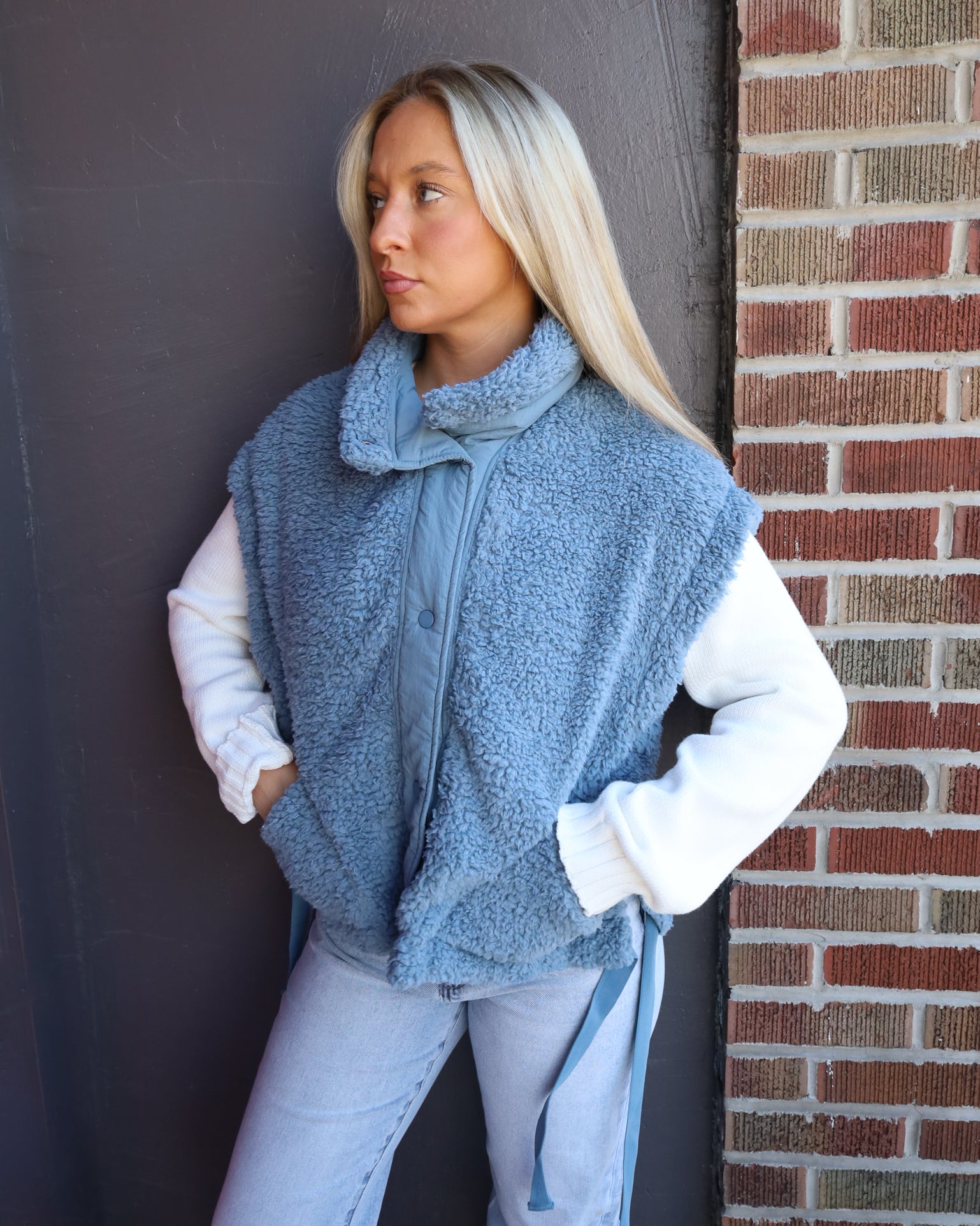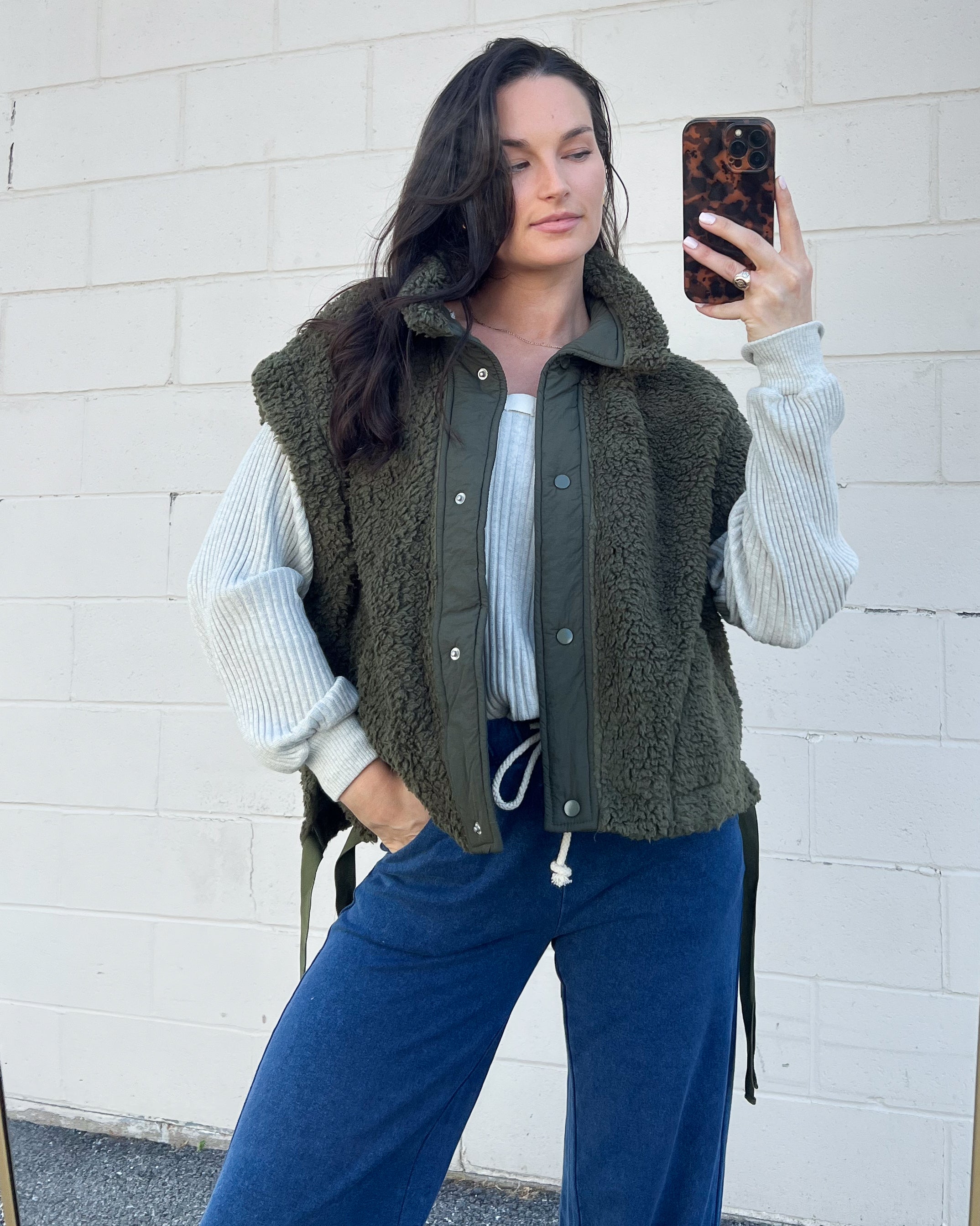 Stay cozy and stylish with this oversized Sherpa vest. With a roomy fit, it's perfect for layering on chilly days.