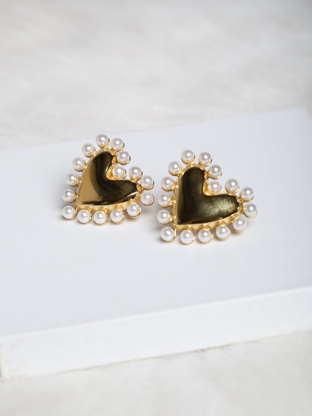 Add some love to your outfit with these playful Pearl Heart Stud Earrings from CHANSUTTPEARLS. The gold heart design is outlined with pearls and the stud post is water resistant. Plus, with a lifetime warranty, these earrings are a playful and practical addition to any jewelry collection!