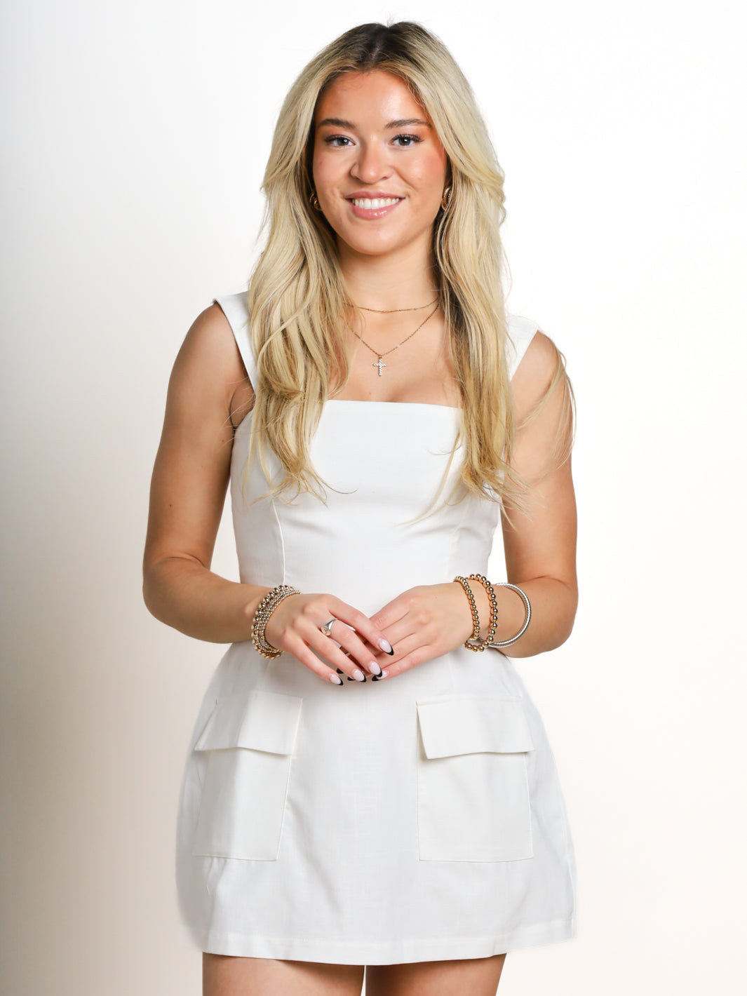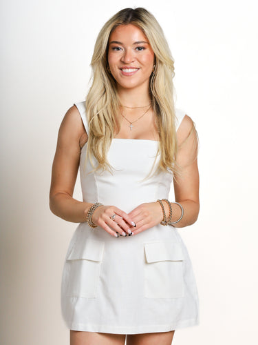 This vibrant romper dress in sunny yellow or white is perfect for strutting your stuff on the runway (or the sidewalk). With a square neck and convenient front pockets, you'll be stylishly comfortable all day long. The adjustable straps and zipper back closure complete the look. Walk it, girl!