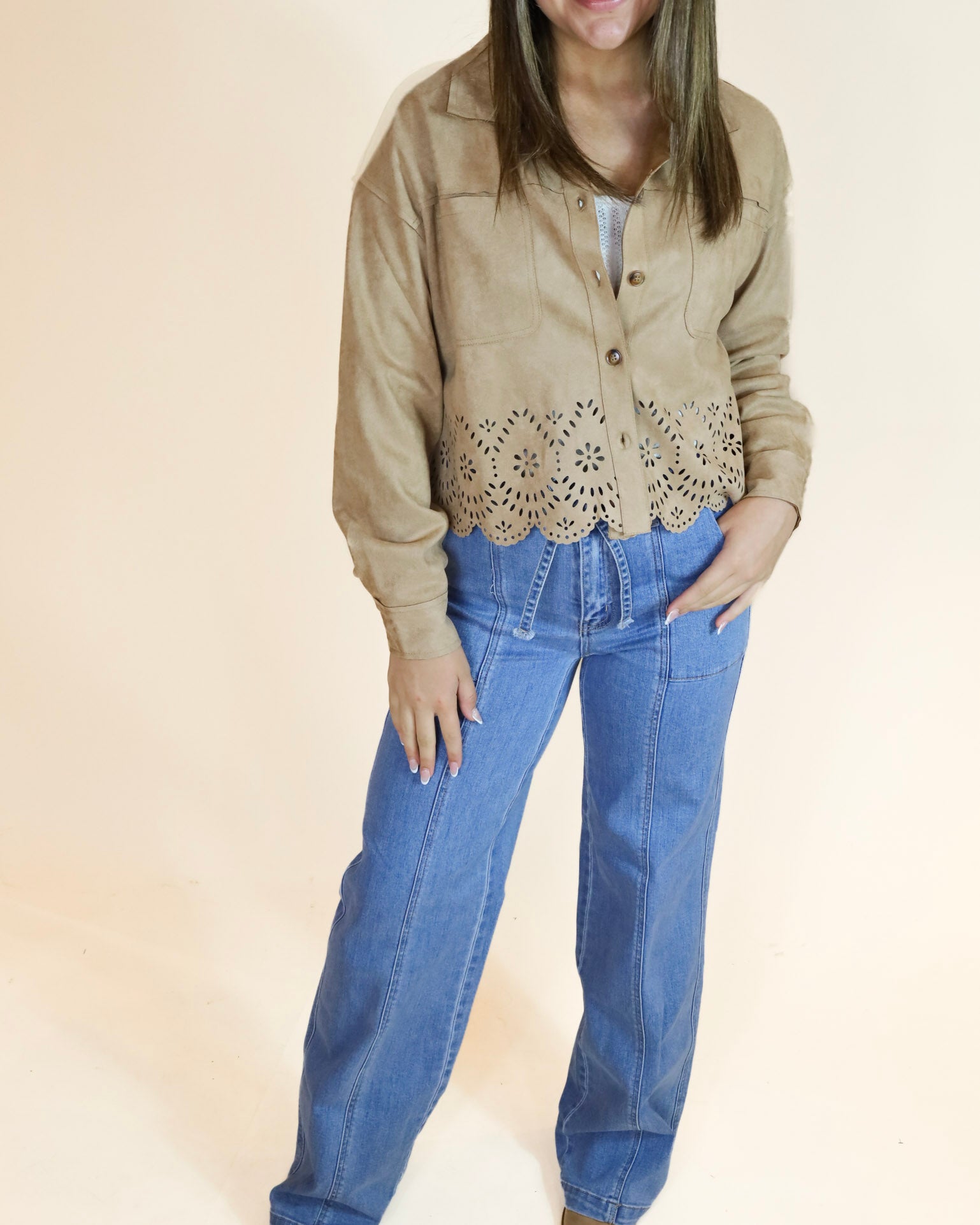 Elevate your style with the Scallop Trim Cutout Jacket, made from luxuriously soft sueded fabric. Its charming scalloped edges and cheeky cutouts add a playful vibe, making it the perfect statement piece to brighten up any look with a flirty finish. Effortlessly fun!