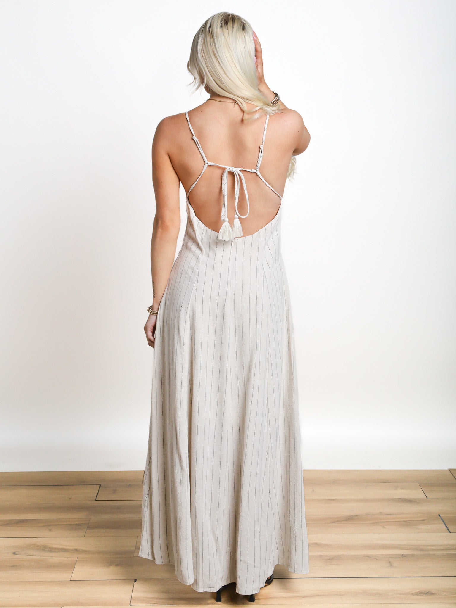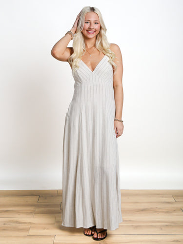 She Will Be Linen Pinstripe V-Neck Maxi Dress
