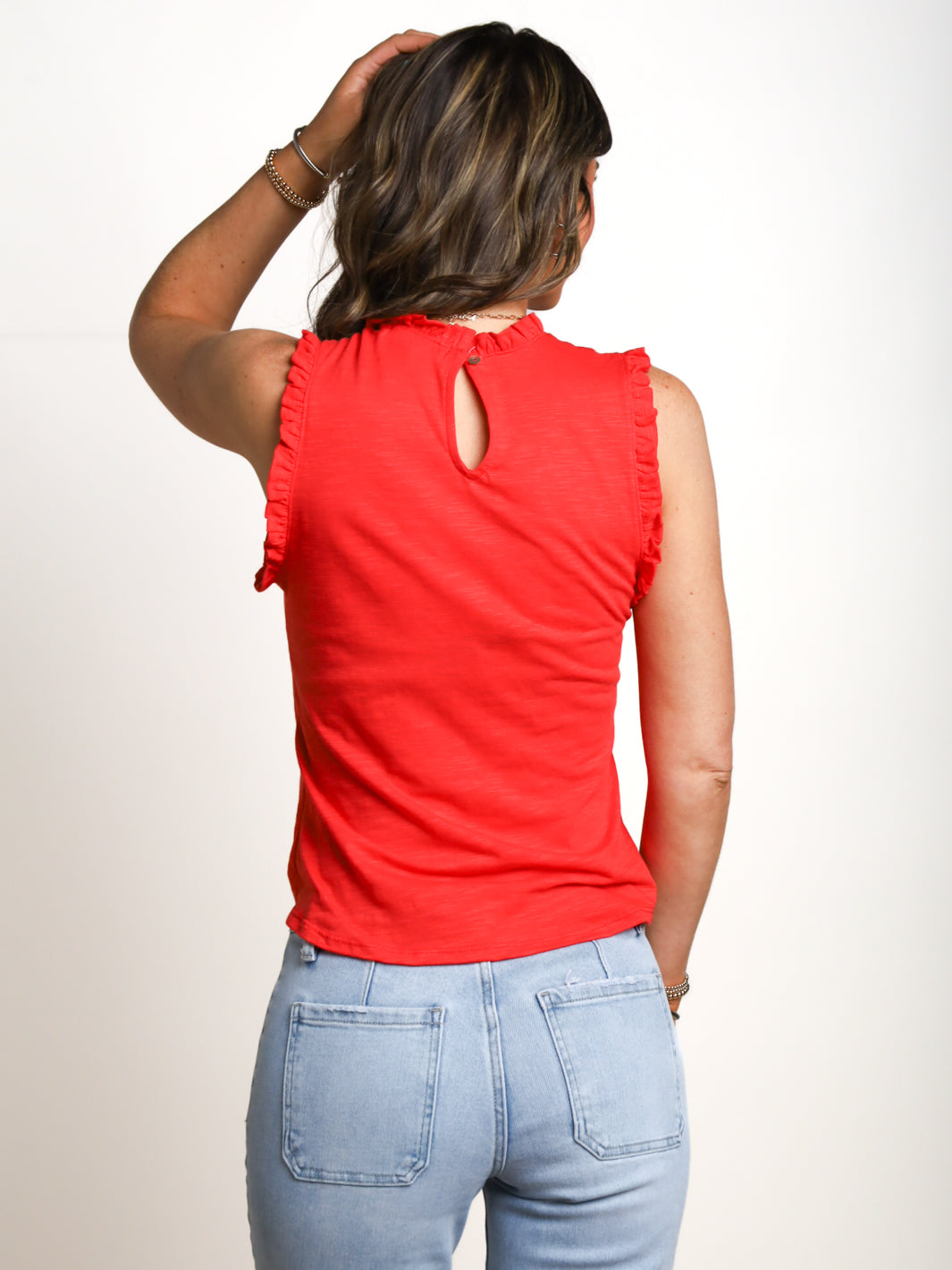 Add a pop of color to your wardrobe with this red tank top. The mock neck and ruffle detailing bring a touch of sophistication to this sleeveless piece. Get ready to turn heads with this stylish and playful addition.