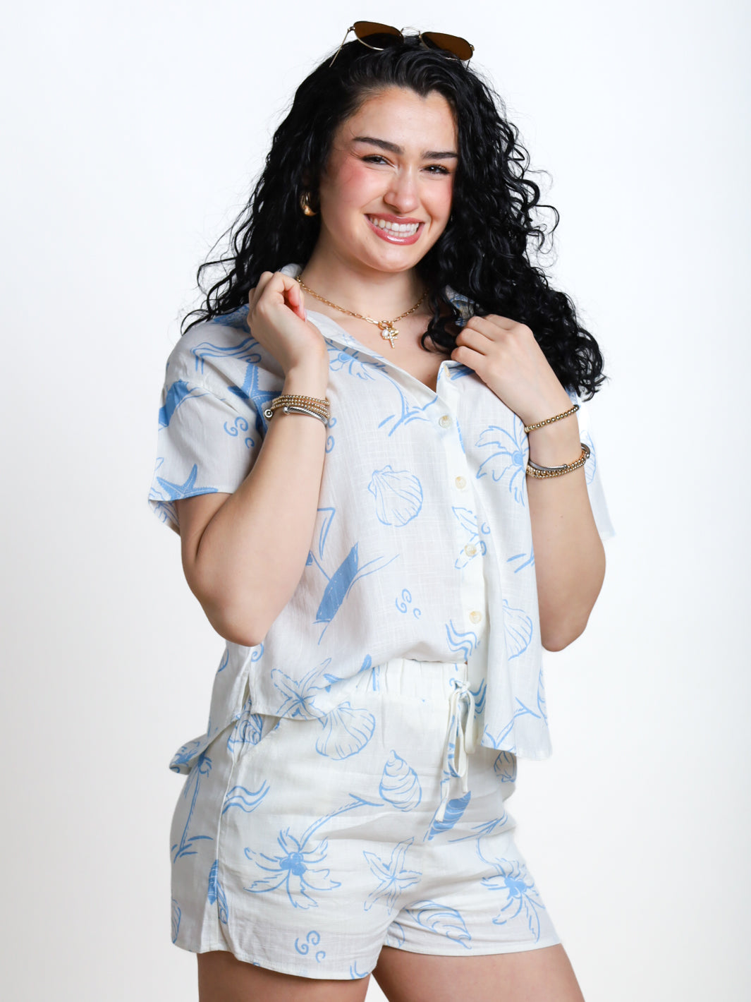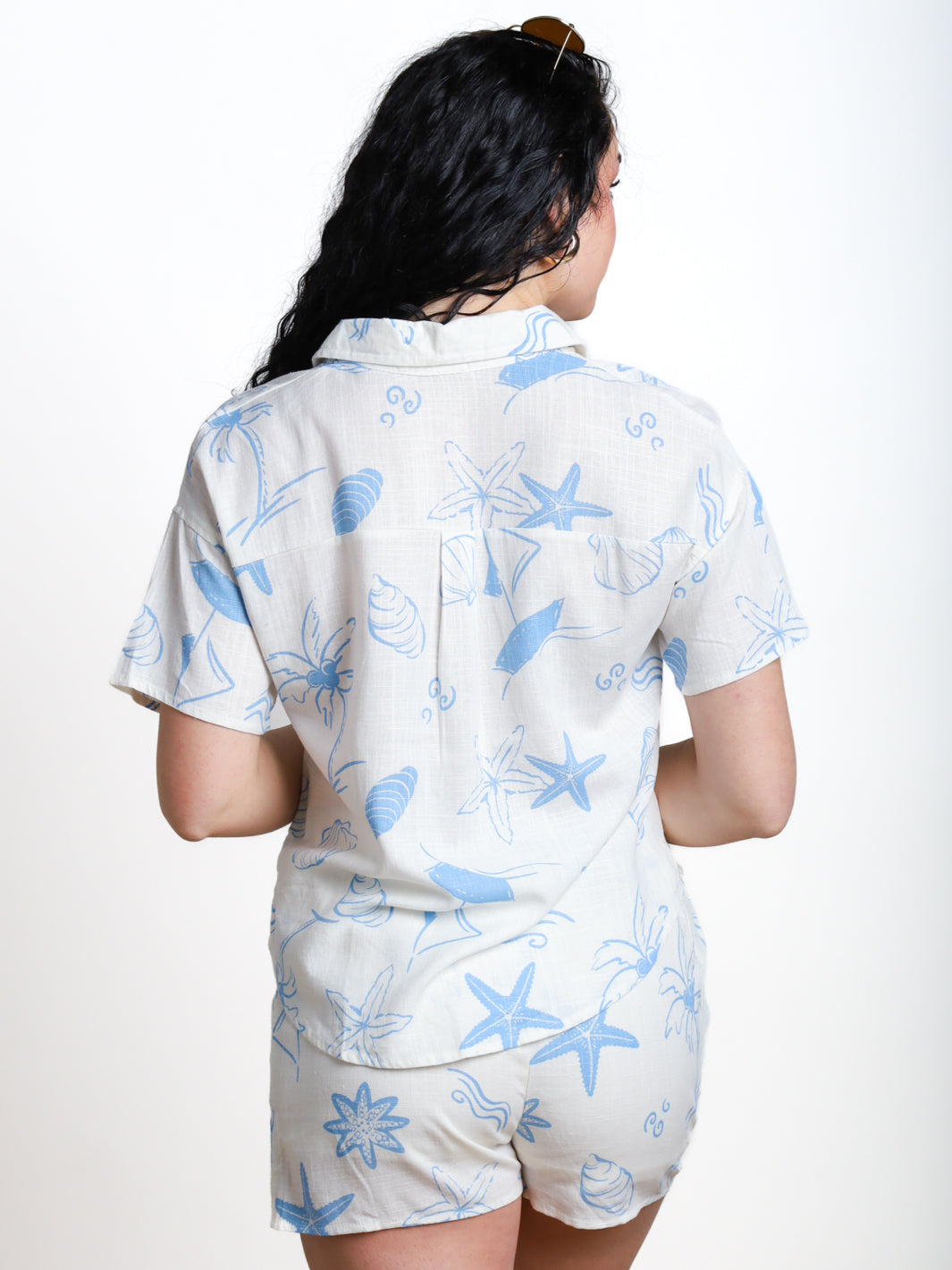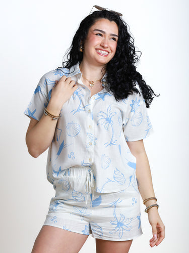 Add a touch of bold to your wardrobe with this blue printed blouse. Its button down design and short sleeves make it a stylish and versatile piece for any occasion. Stay chic and cool with this must-have top!
