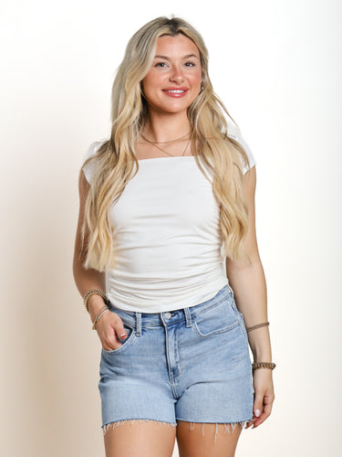 Add a touch of chic to your wardrobe with our Bare Touch Square Neck Side Ruched Top! Available in black or ivory, this top features a square neck and short sleeves, with side ruching for a flattering fit. Perfect for any occasion, this top will make you stand out with its unique style.