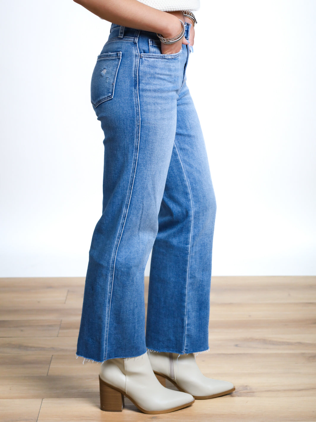 Get ready to fly high with the Blake High Rise Slim Wide Leg Jeans by FLYING MONKEY! These medium wash denim jeans feature a high rise for a flattering fit, a slim wide leg for a trendy look, and a raw cut hem for a touch of edge. With 5-pocket detail and a button and zipper front closure, these jeans are the perfect combination of style and functionality. Don't miss out on these must-have jeans!