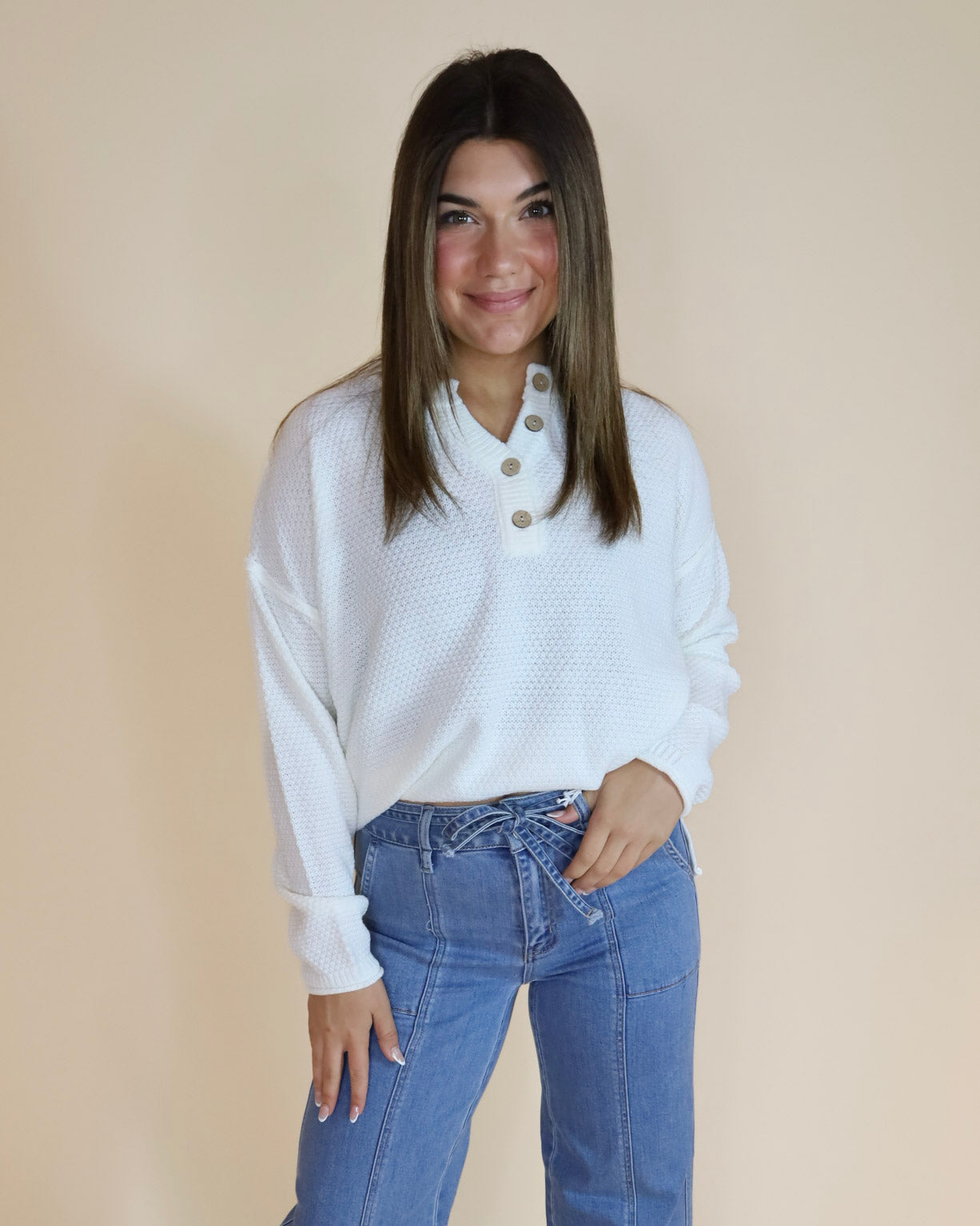 Stay cozy and cool with this playful white Henley Button Front Sweater. Crafted from soft acrylic, it offers warmth without weighing you down. The button-front detail adds a charming twist, perfect for layering or wearing solo. Whether you're lounging or stepping out, this sweater brings effortless style with a fun, relaxed vibe.
