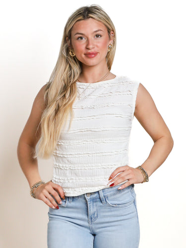 Add some charm to your wardrobe with this Quiet Beauty Frill Lace Open Back Top. The ivory frill lace provides a touch of elegance while the open back and tie back detail add a playful twist. Perfect for any occasion, this sleeveless top will keep you stylish and comfortable all day long.