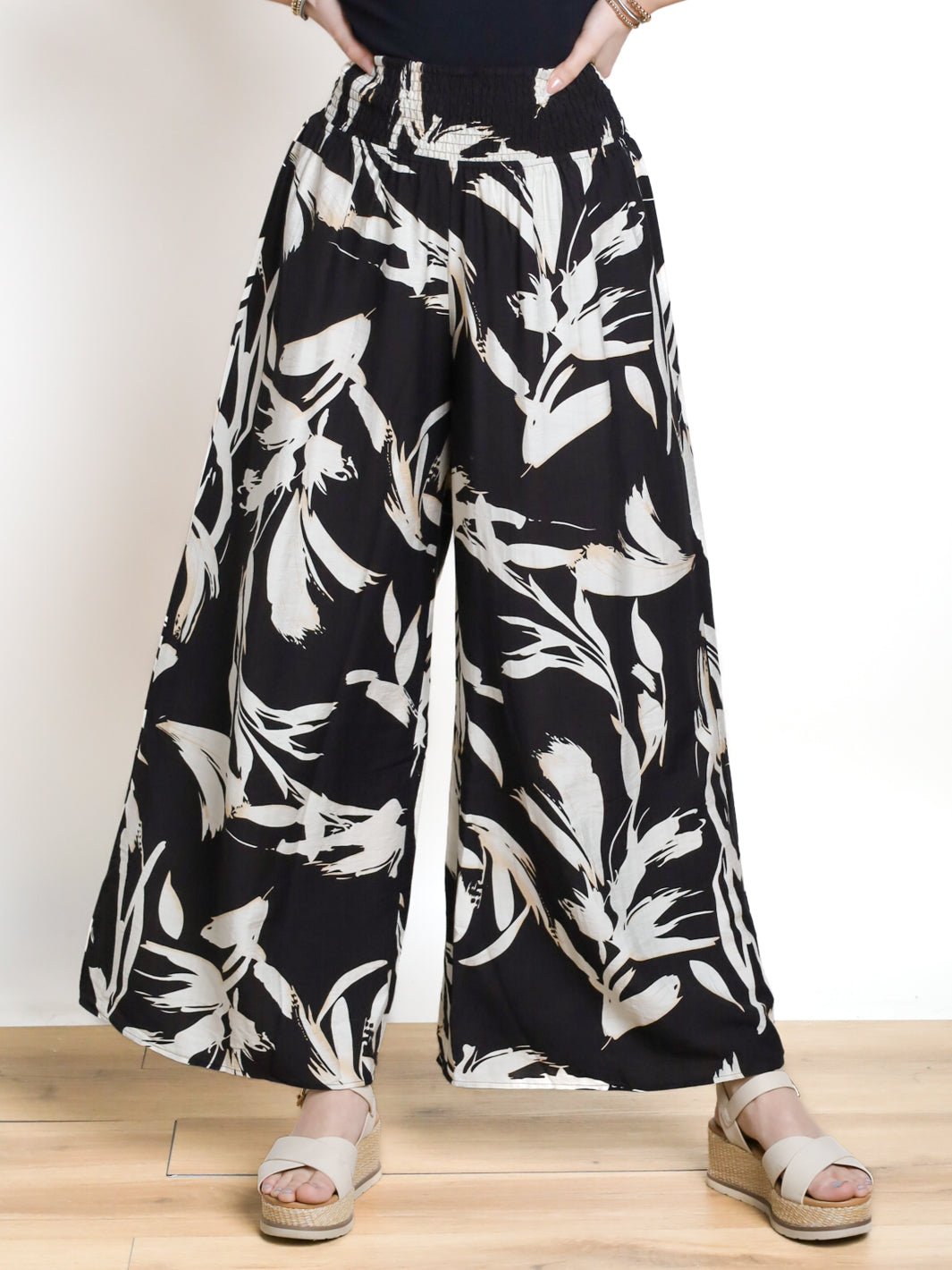 Set sail in style with our Sail Away Smocked Waist Wide Leg Print Pants. Featuring a playful black print and a comfortable wide leg fit, these pants are sure to turn heads. The smocked waist adds a touch of whimsy to your wardrobe.