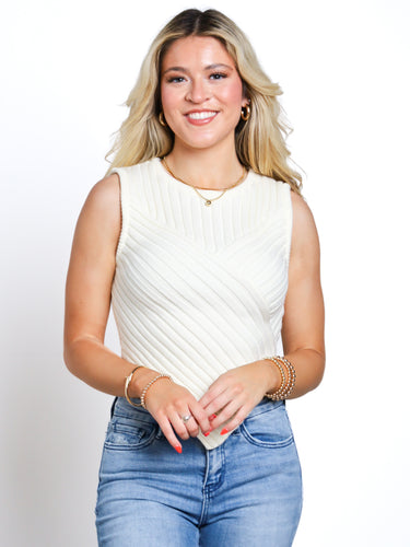 Lighten up your winter wardrobe with our Unapologetic Sleeveless Sweater. This white knit sweater features a quirky scarf hem and a comfortable round neckline. Stay stylish and cozy without sacrificing your playful side.