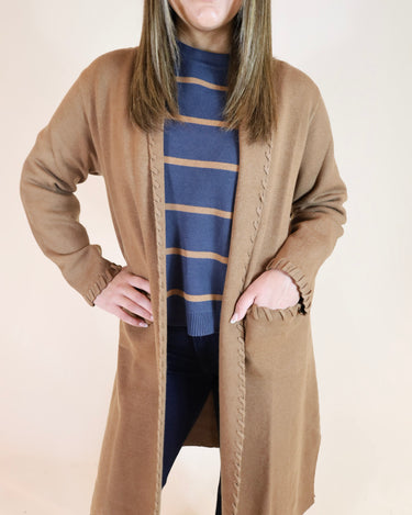 Wrap yourself in cozy charm with the Woven Trim Long Line Cardigan. Its stylish woven trim adds a fun twist to your everyday look, while the long, flowing fit keeps you comfortably covered. Perfect for layering on breezy days, this cardigan effortlessly blends comfort and flair to brighten up any outfit.